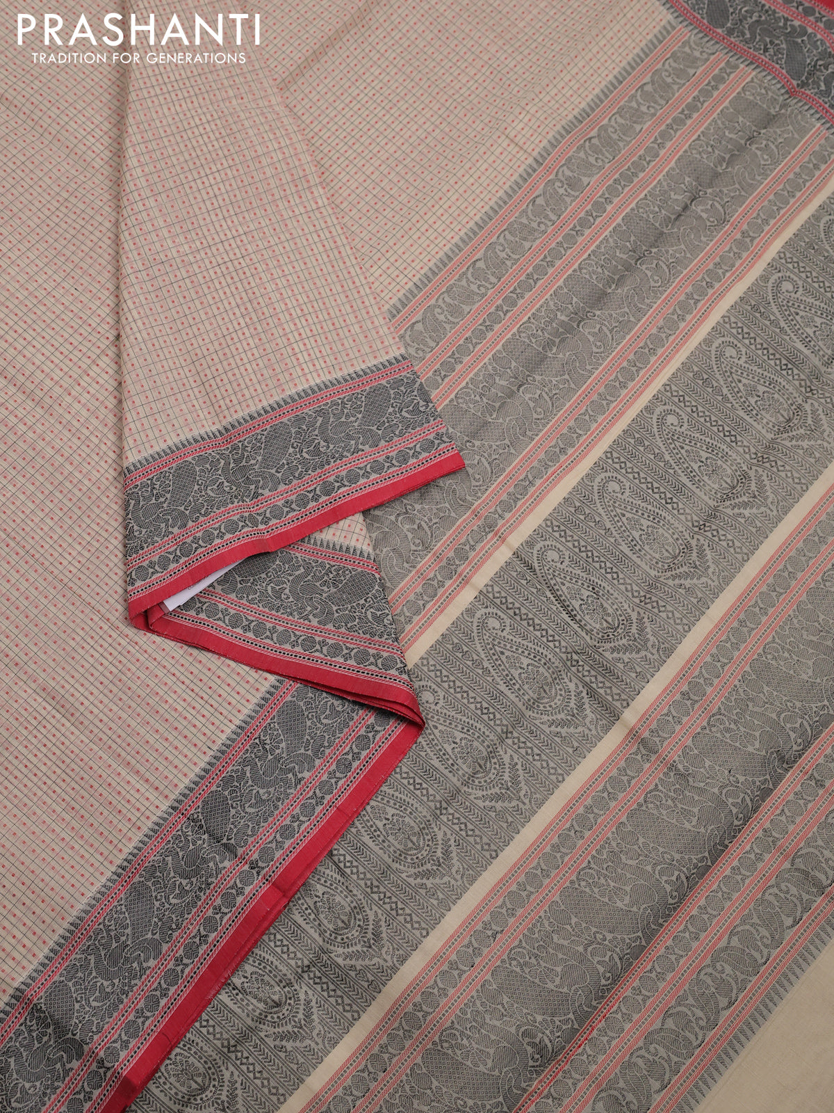 Kanchi cotton saree cream and red with allover lakshadeepam weaves and thread woven border