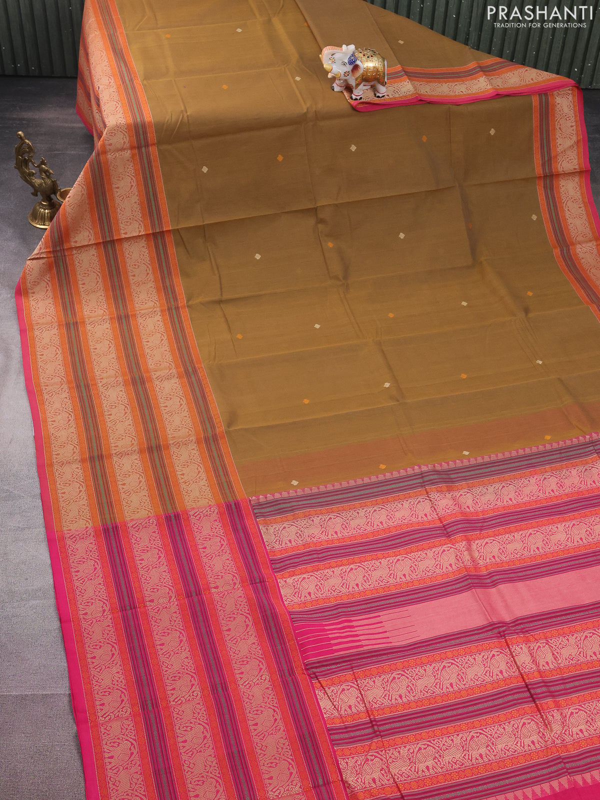 Kanchi cotton saree dark mustard and pink with thread woven buttas and long thread woven border