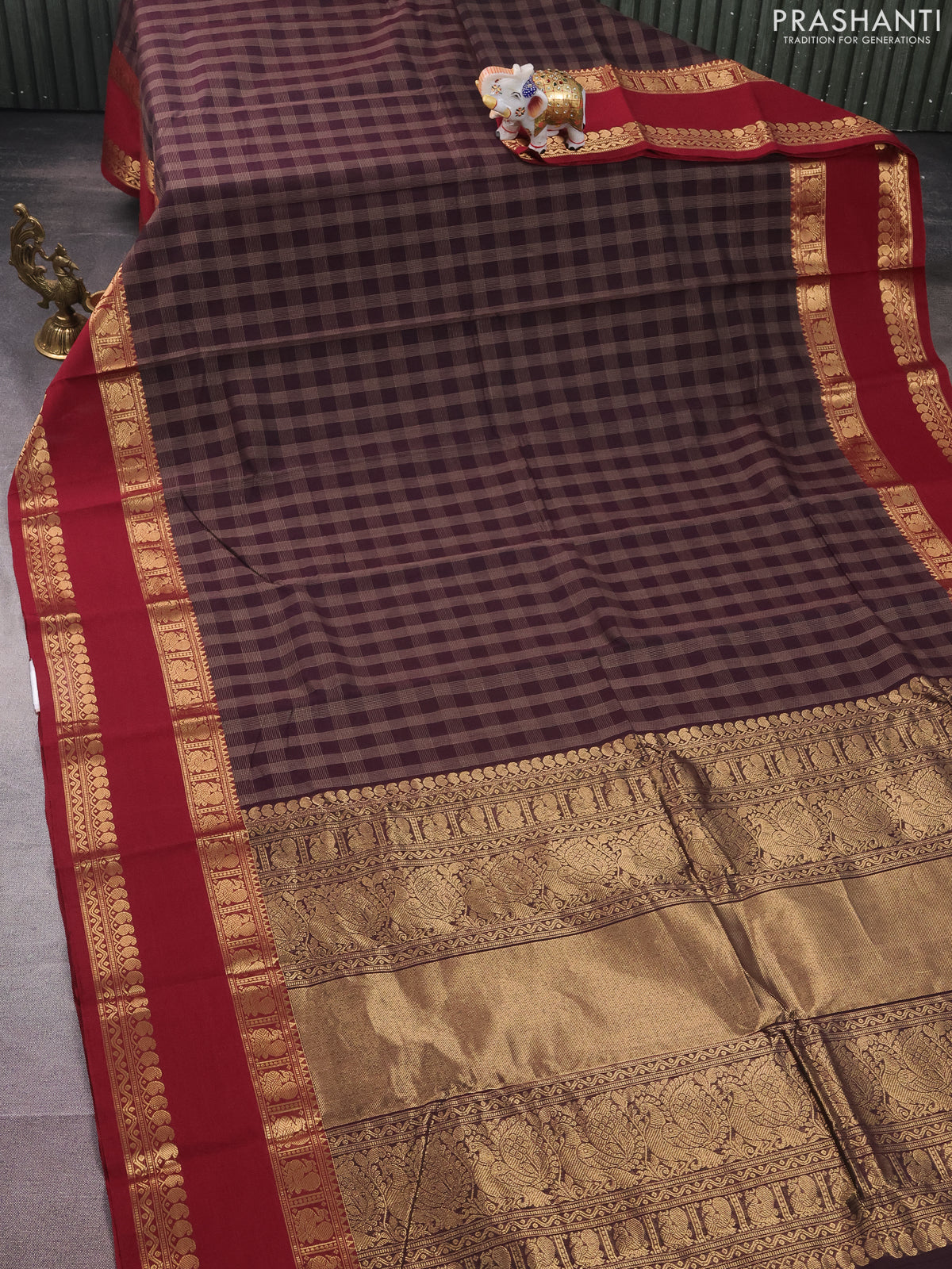 Kanchi cotton saree deep jamun and maroon with allover thread checked pattern and rettapet zari woven border