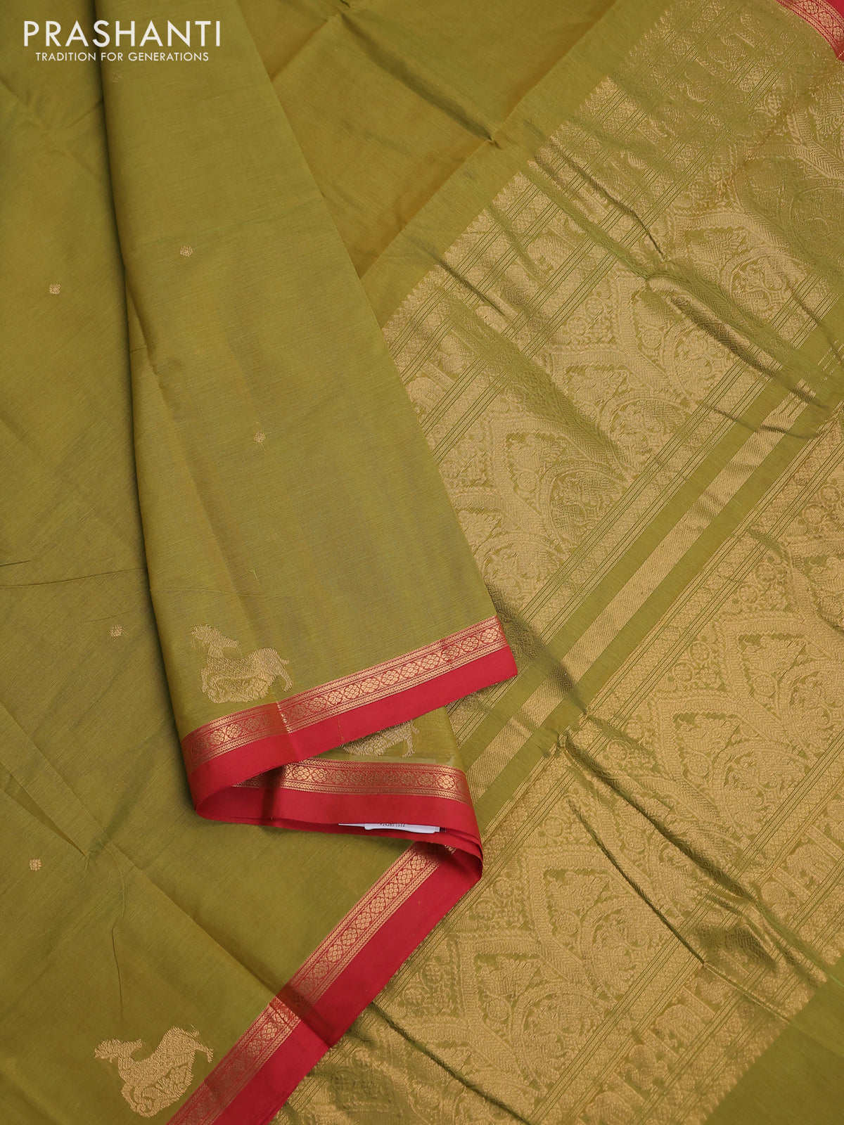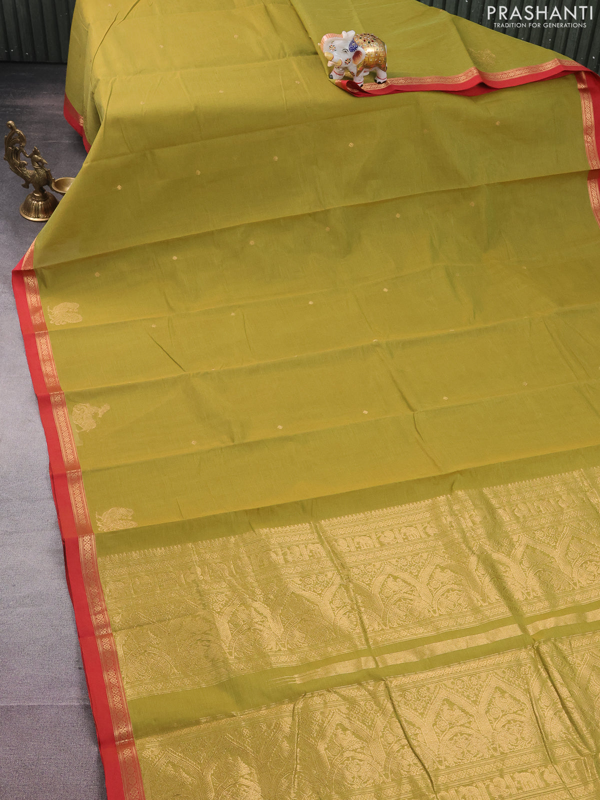 Kanchi cotton saree light green and red with zari woven buttas and zari woven border