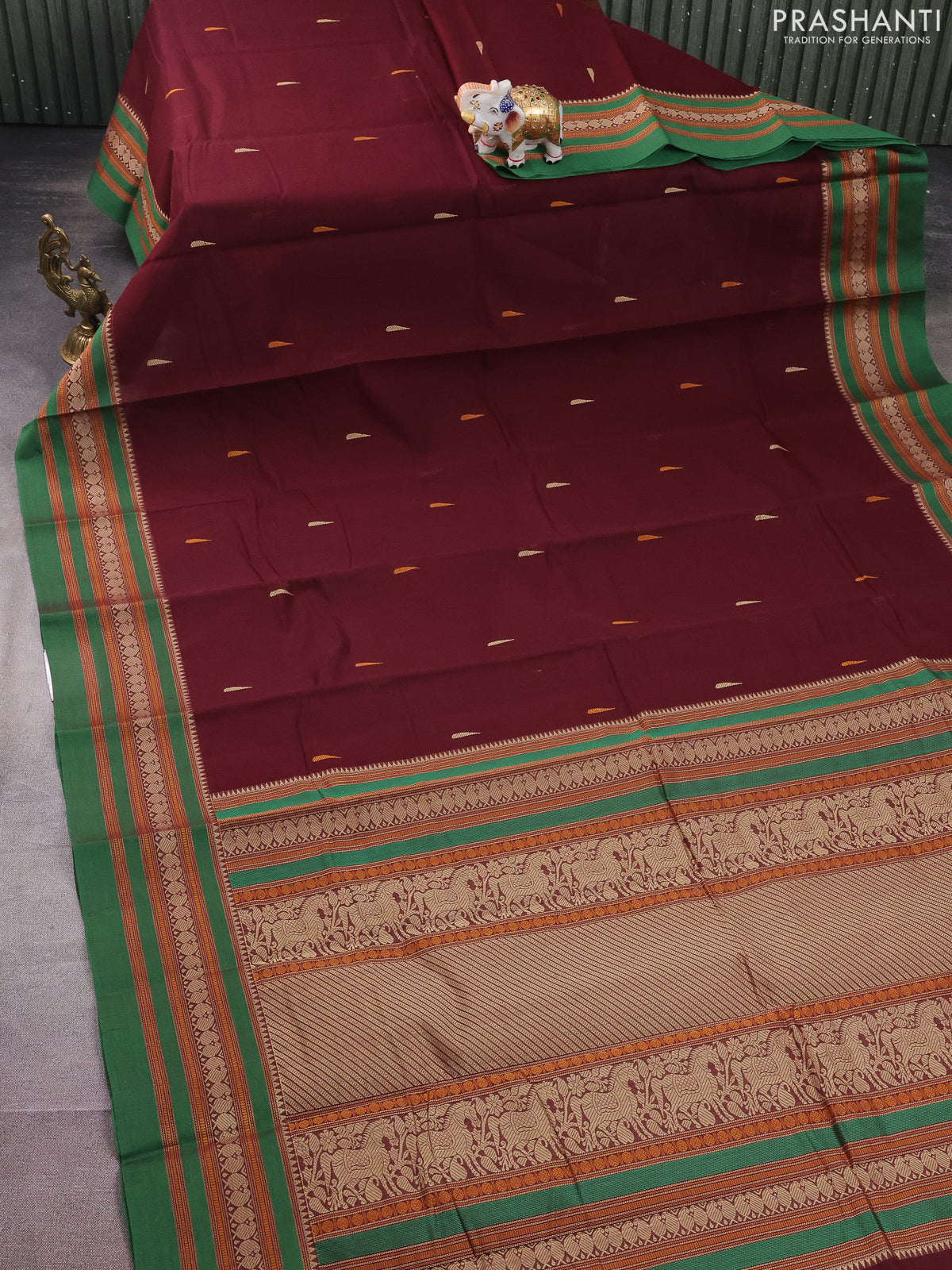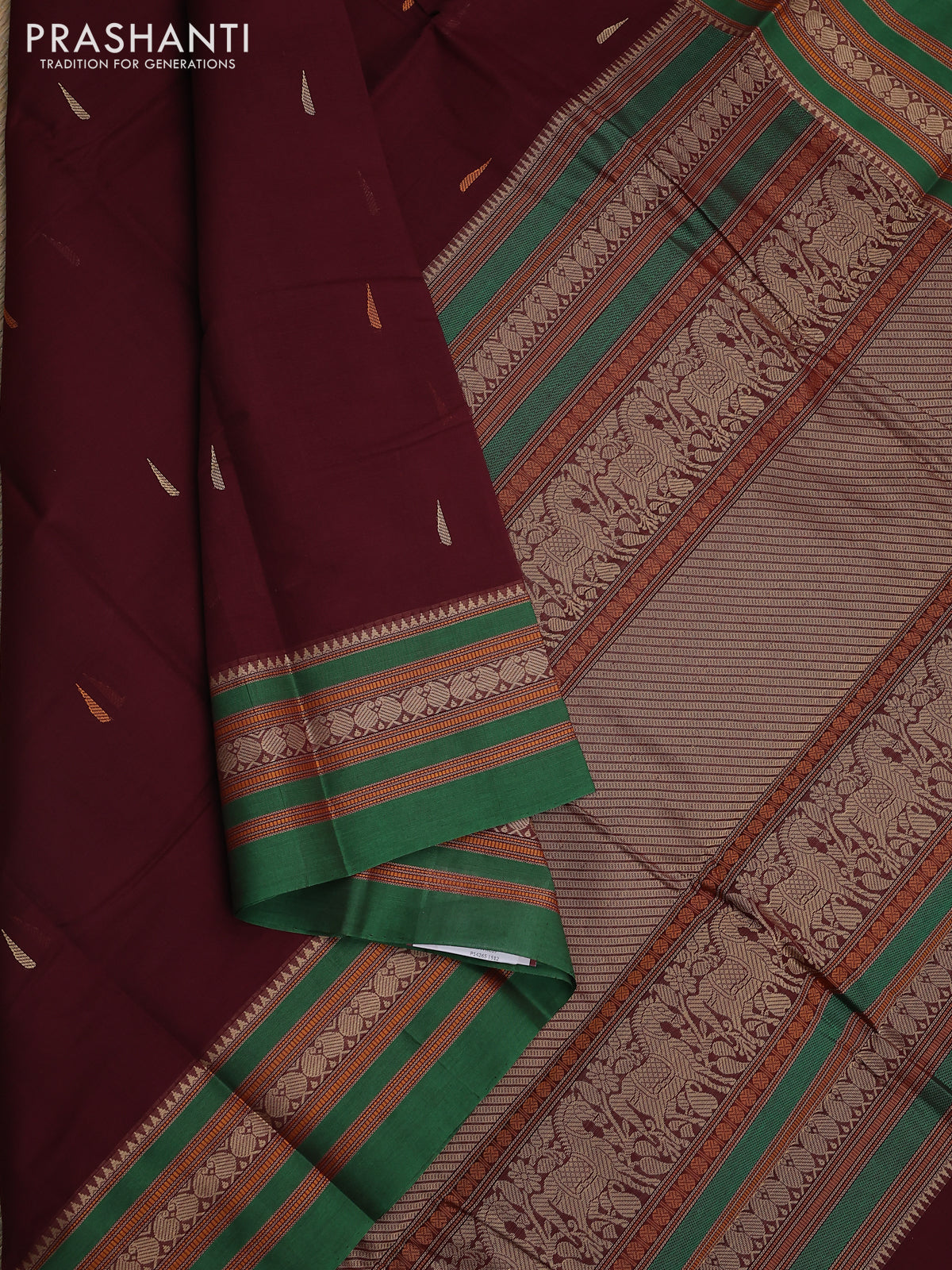 Kanchi cotton saree maroon and green with thread woven buttas and thread woven border