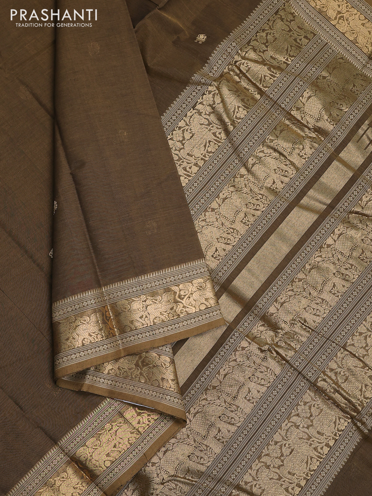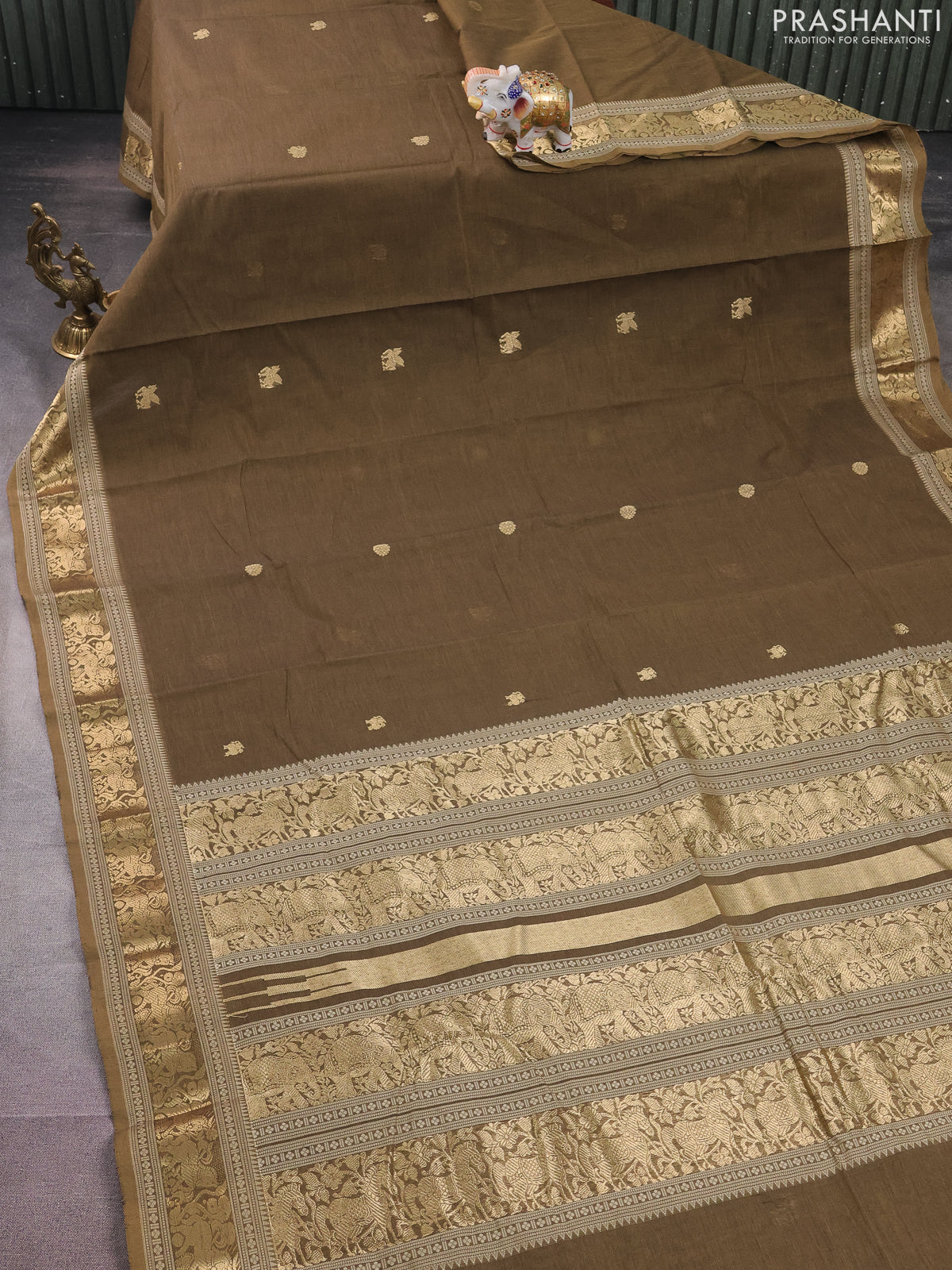 Kanchi cotton saree military green with zari woven buttas and zari woven border