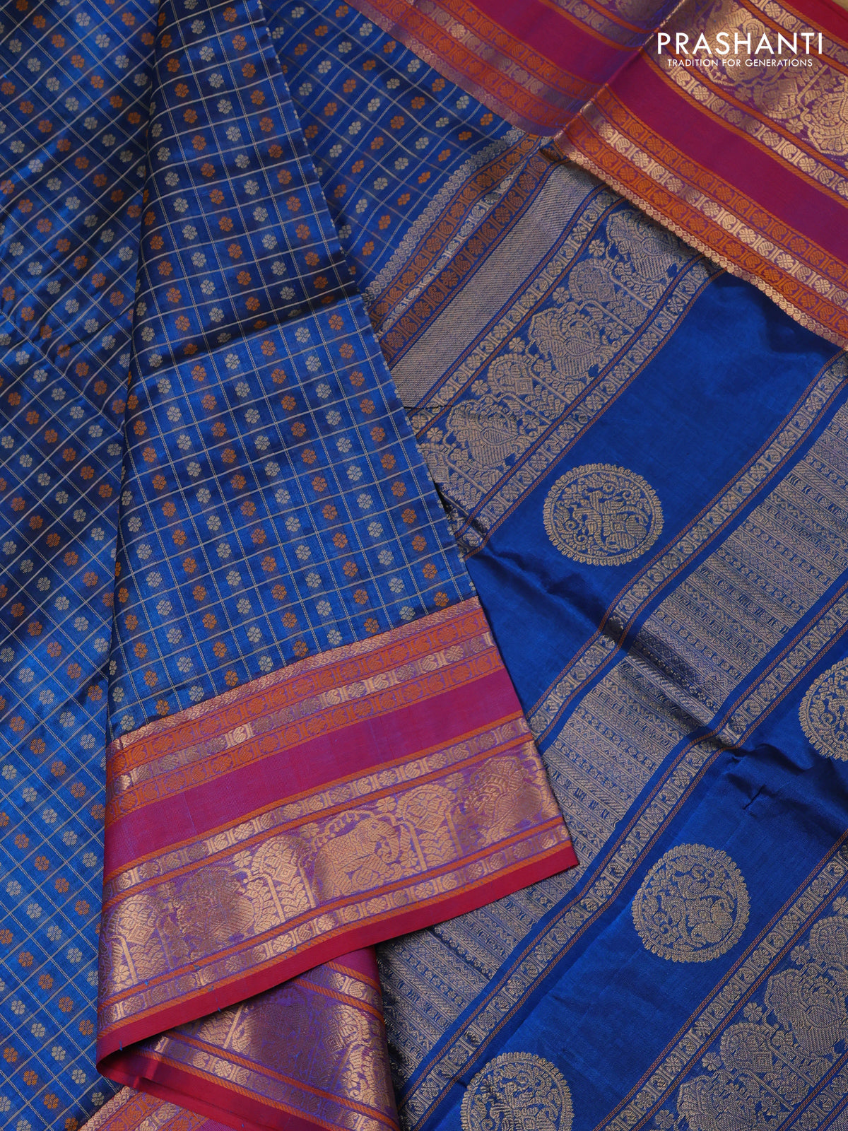 Kanchipuram silk cotton saree cs blue and maroon with allover thread checks & 1000 buttas and long zari woven border