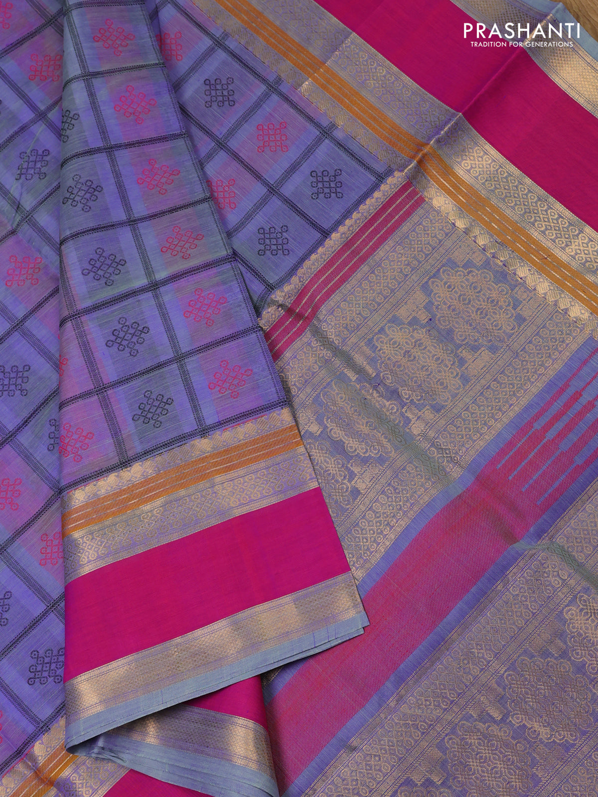 Kanchipuram silk cotton saree dual shade of blue and magenta pink with allover thread checks & buttas and rettapet zari woven border
