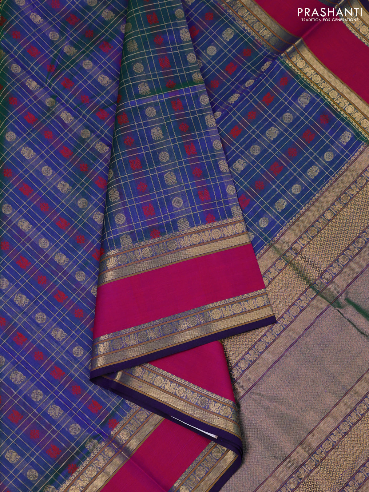 Kanchipuram silk cotton saree dual shade of bluish green and pink with allover zari checks & buttas and rettapet zari woven border