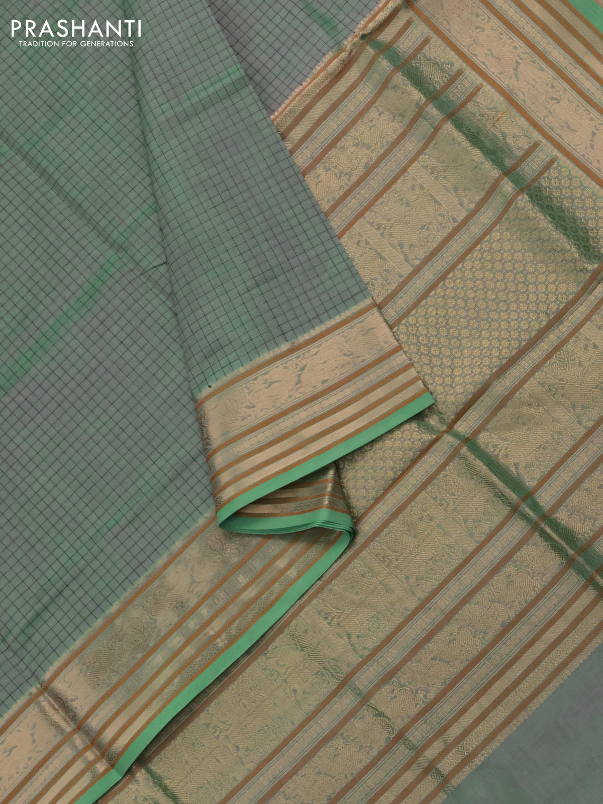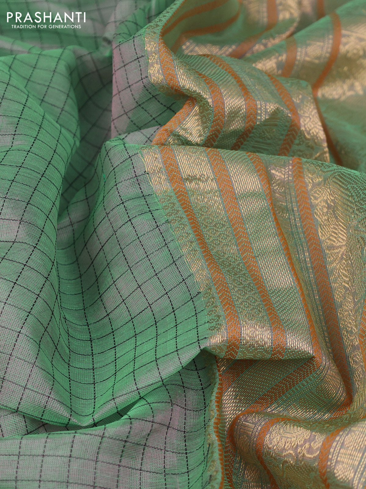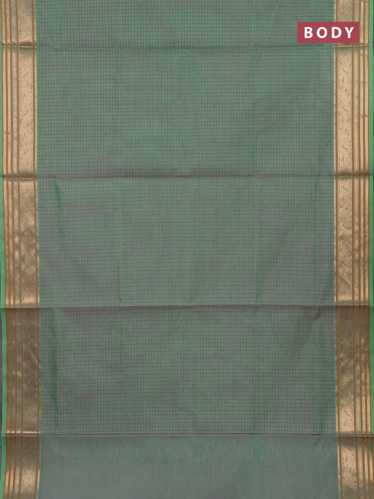 Kanchipuram silk cotton saree dual shade of green with allover thread woven checked pattern and zari woven border