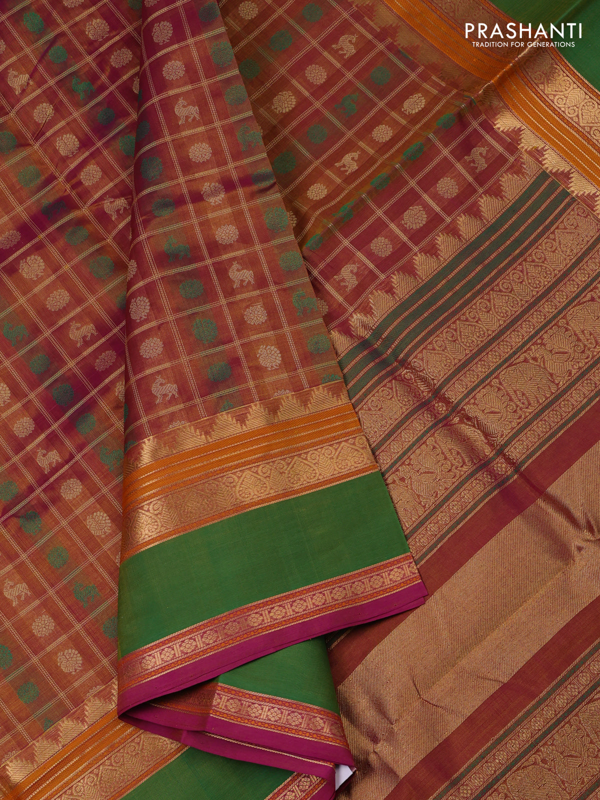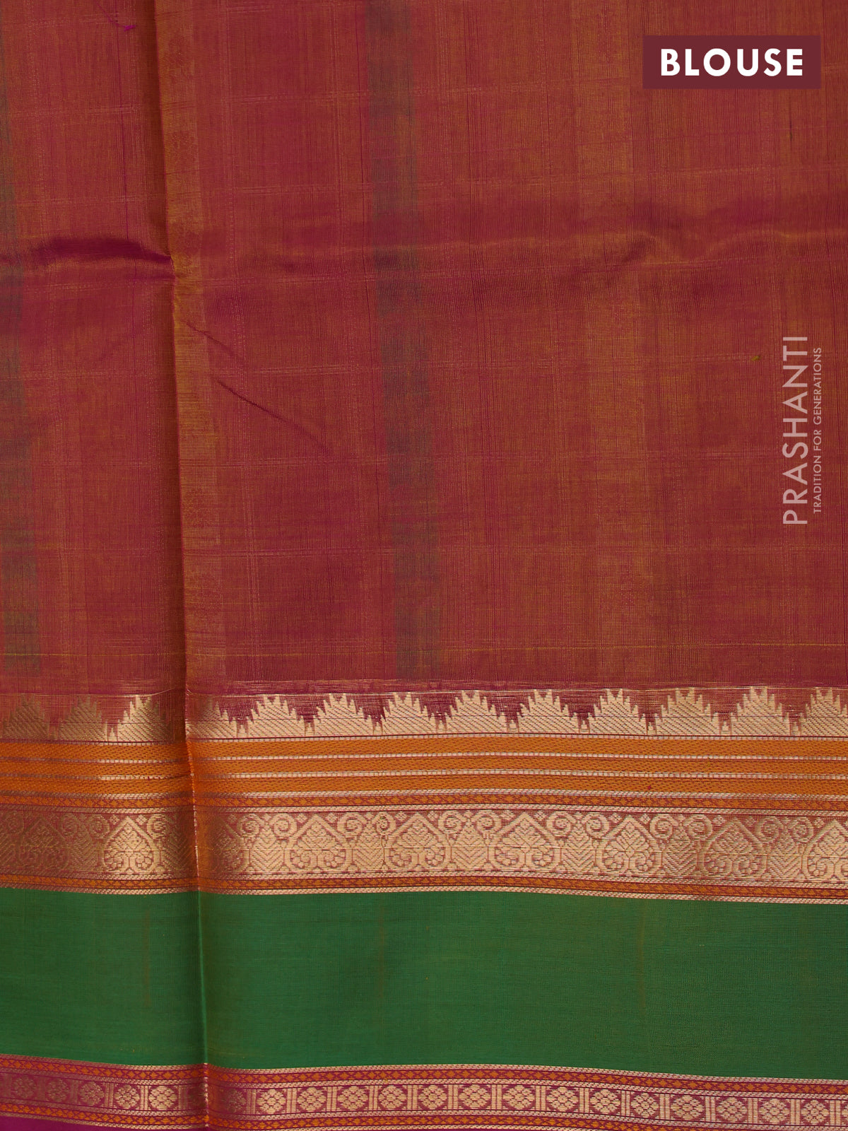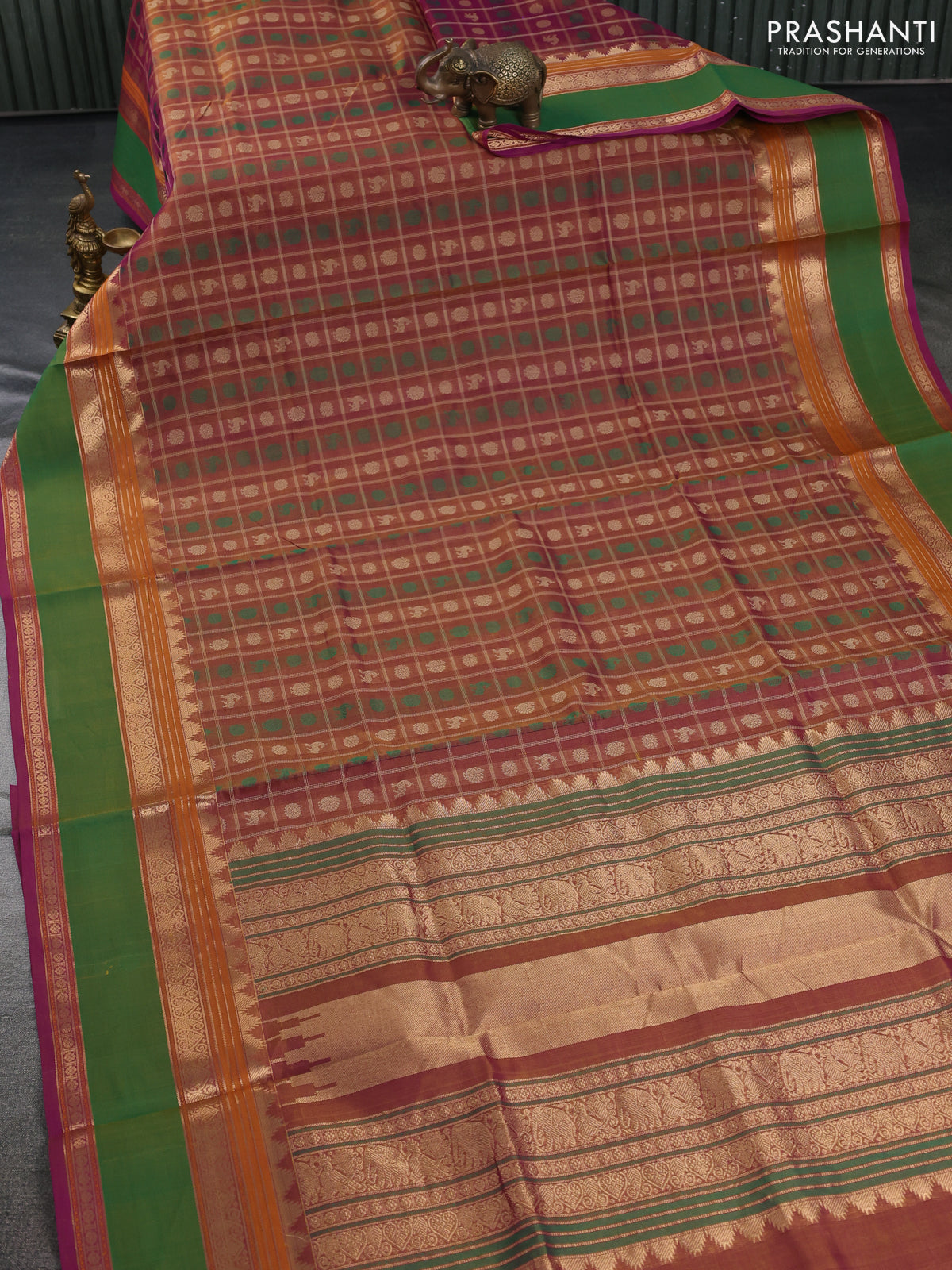 Kanchipuram silk cotton saree dual shade of purple and green with allover thread checks & buttas and rettapet zari woven border