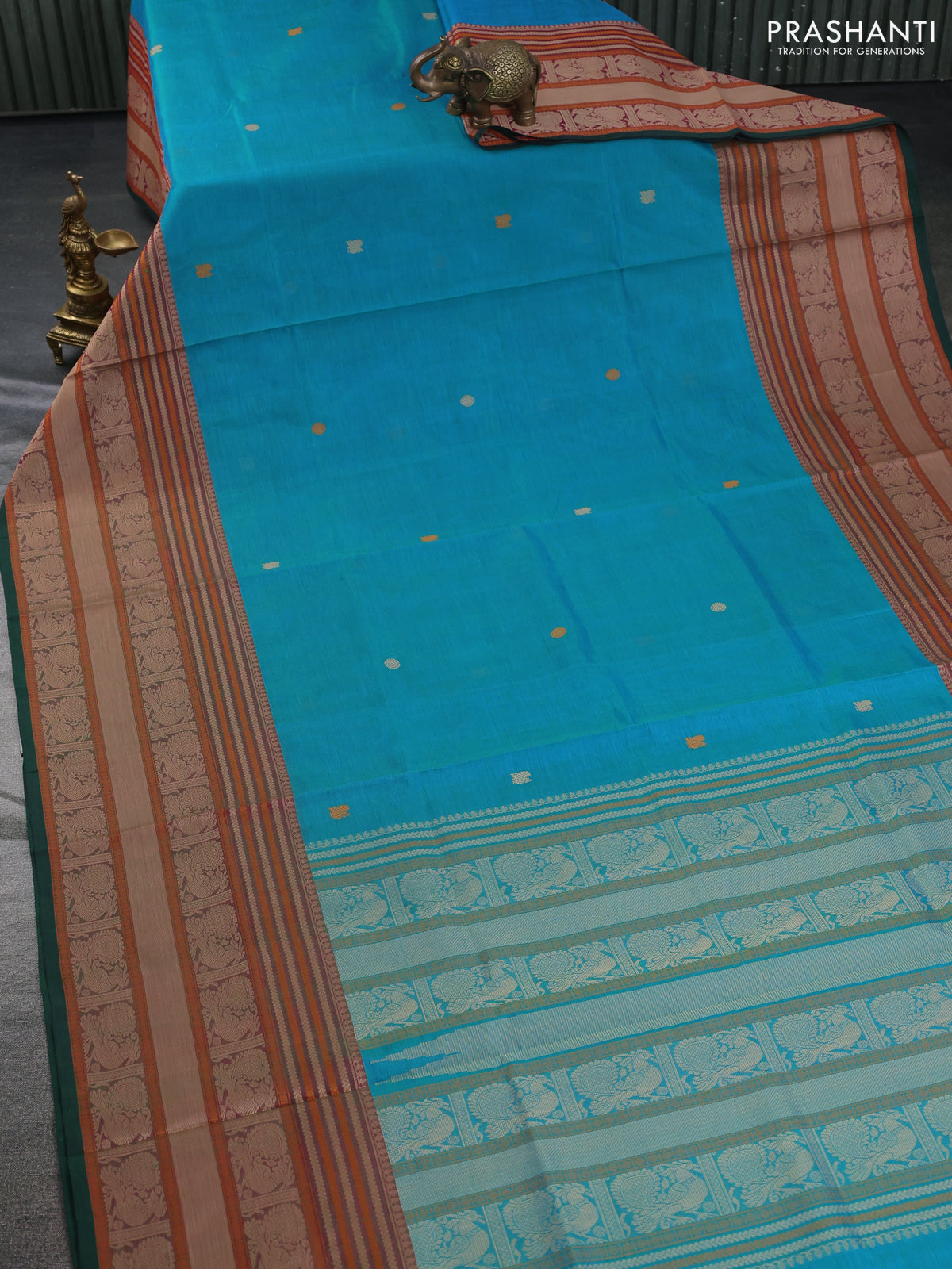 Kanchipuram silk cotton saree dual shade of teal bluish green and green with zari woven buttas and thread woven border