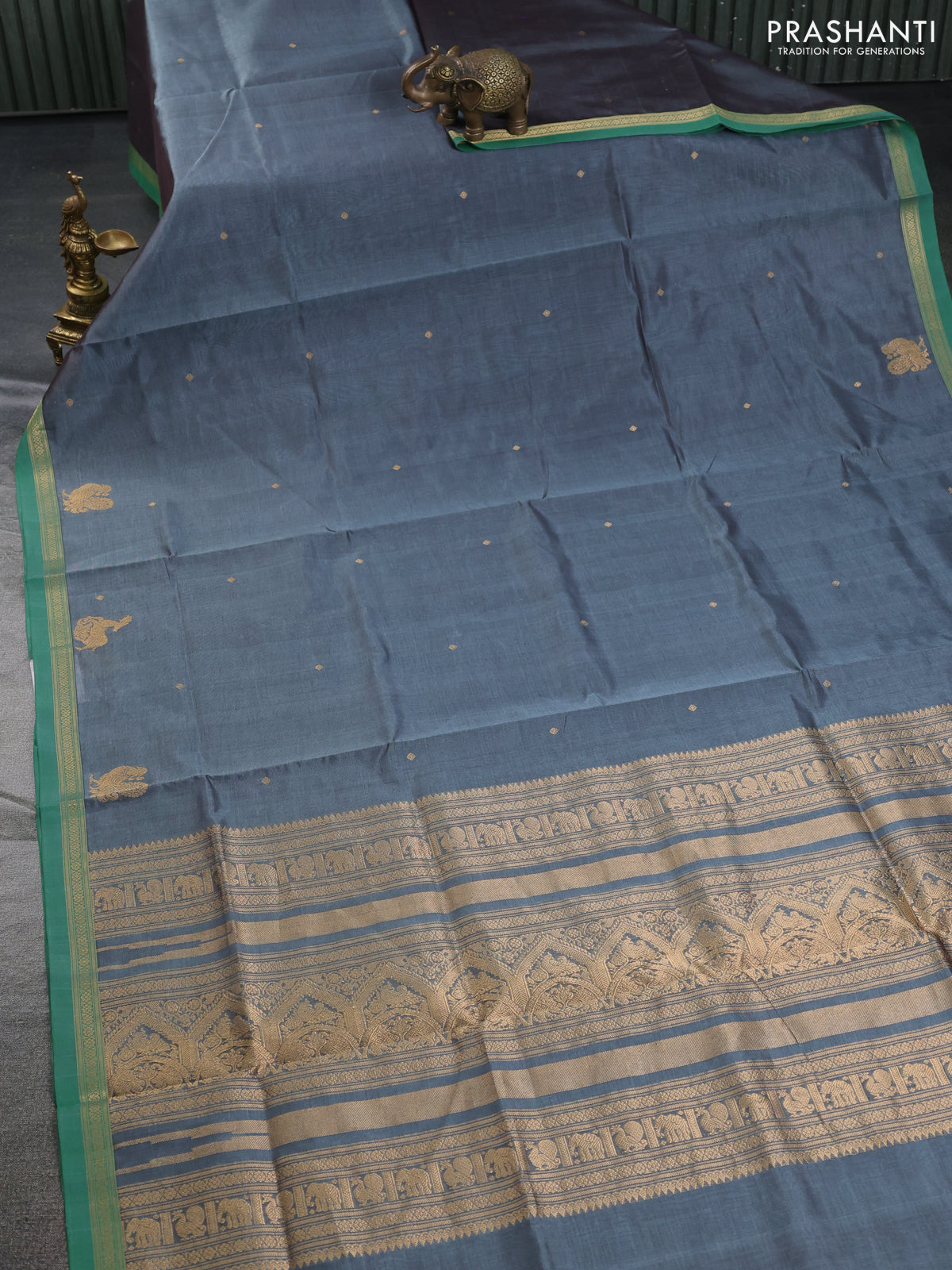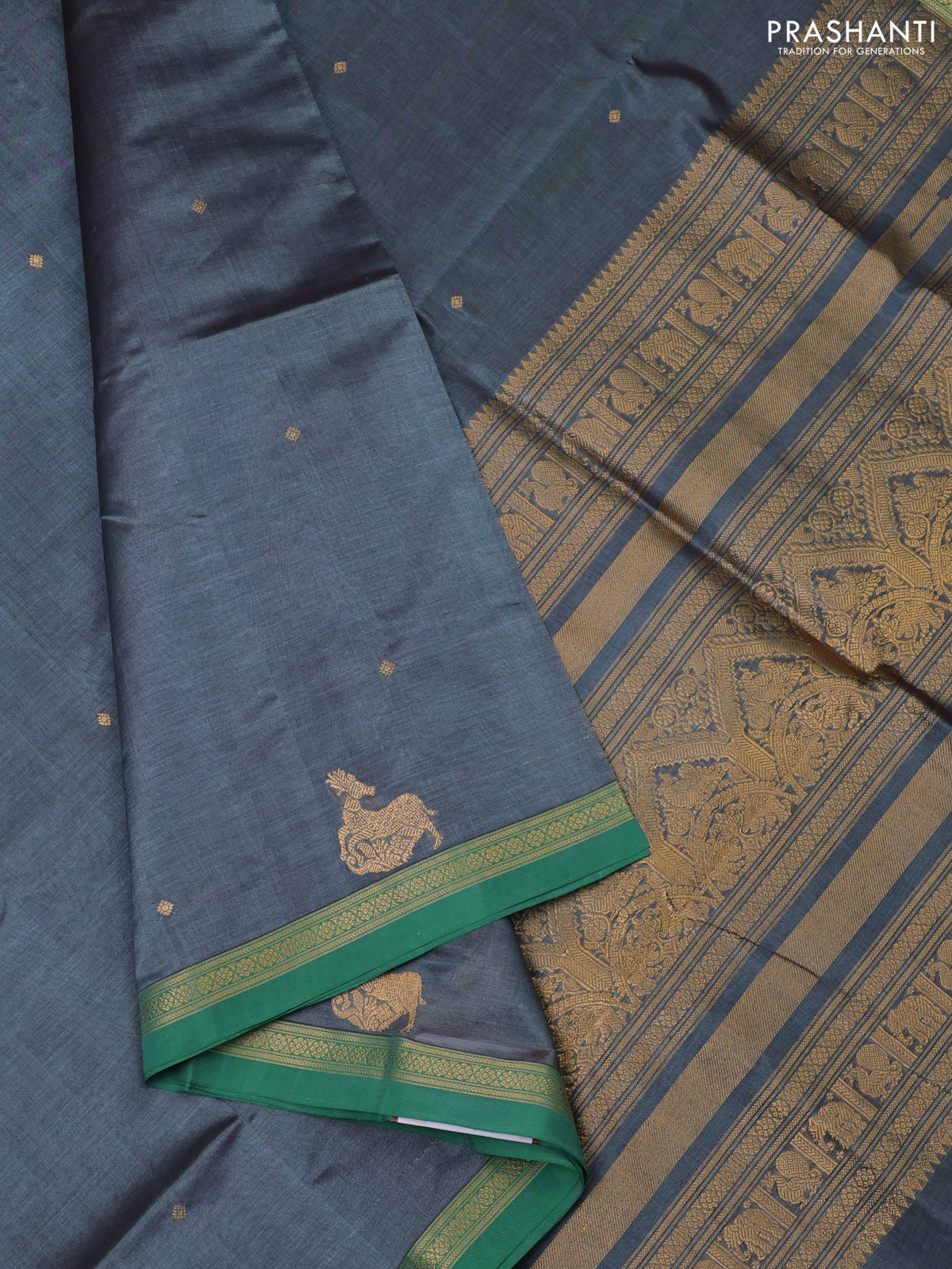 Kanchipuram silk cotton saree grey and green with zari woven buttas and zari woven border