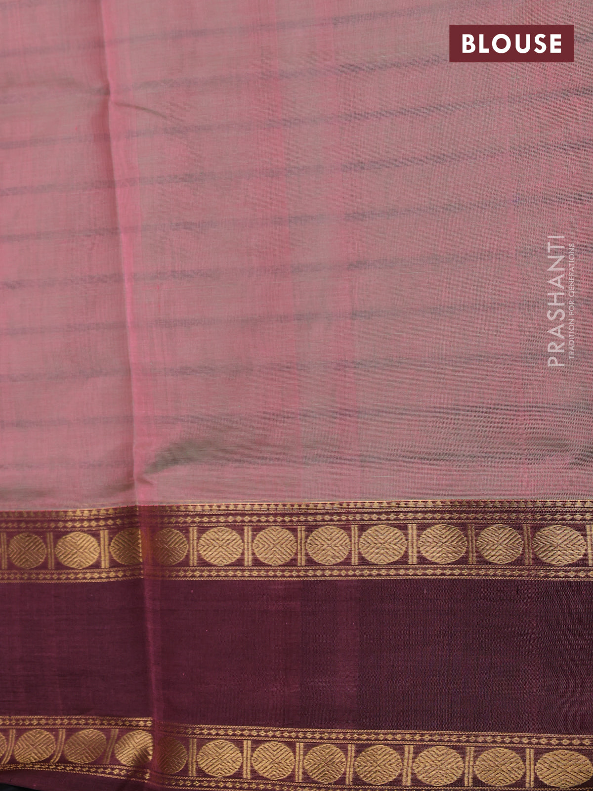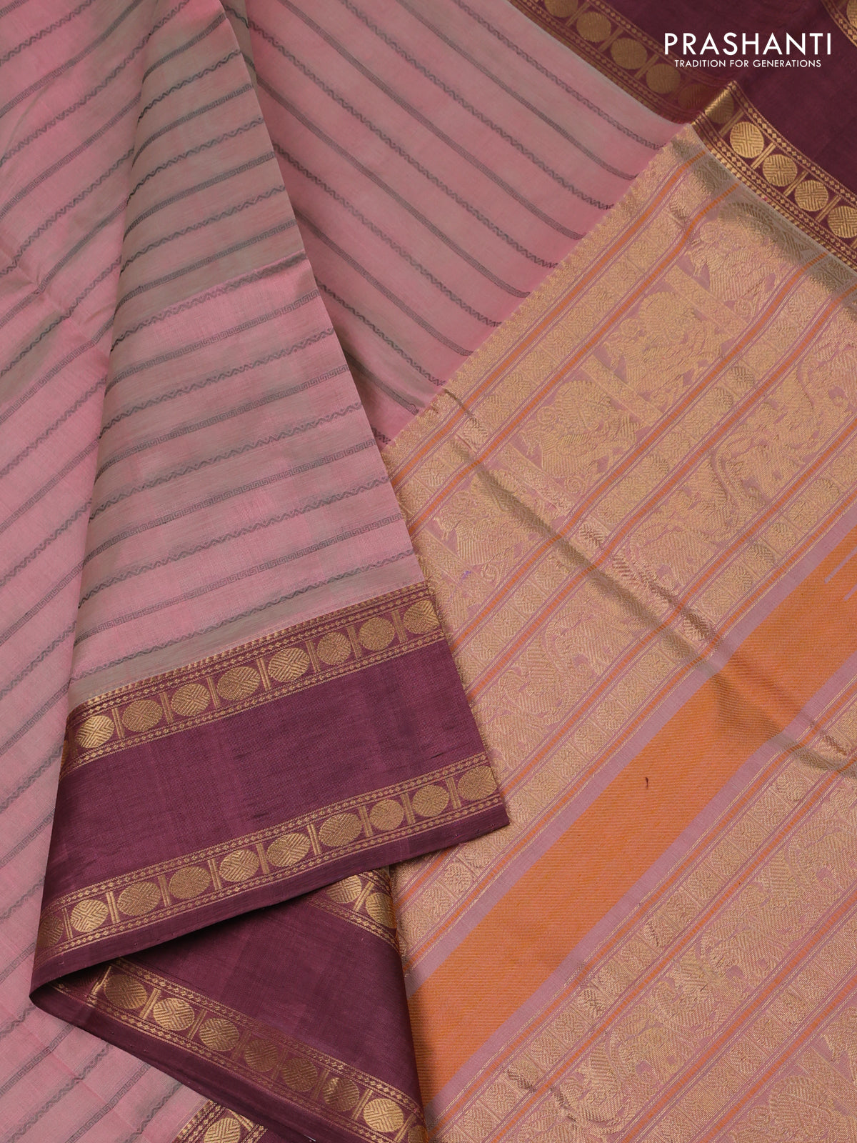 Kanchipuram silk cotton saree pastel pink and mauve pink with thread woven stripes pattern and rettapet zari woven border
