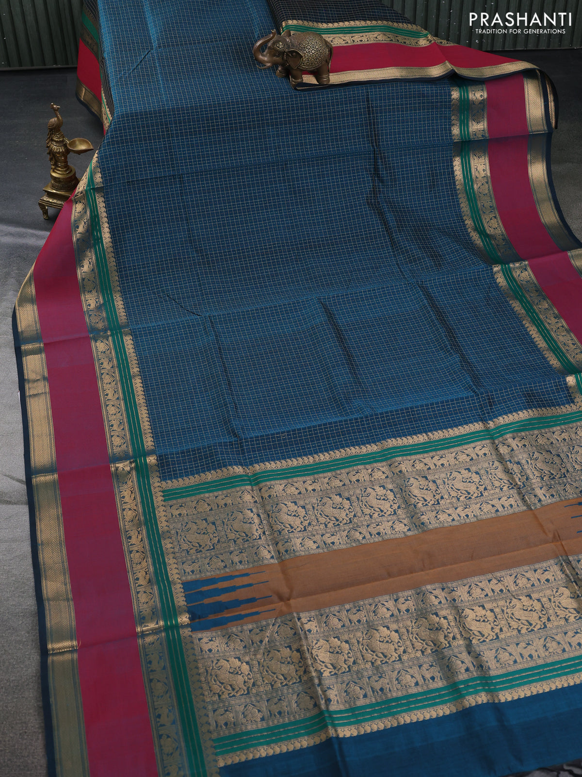 Kanchipuram silk cotton saree peacock blue and maroon with allover lakshadeepam pattern and rettapet zari woven border