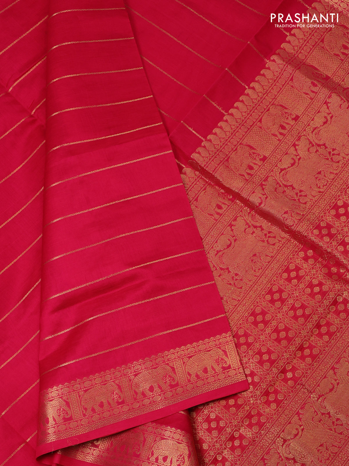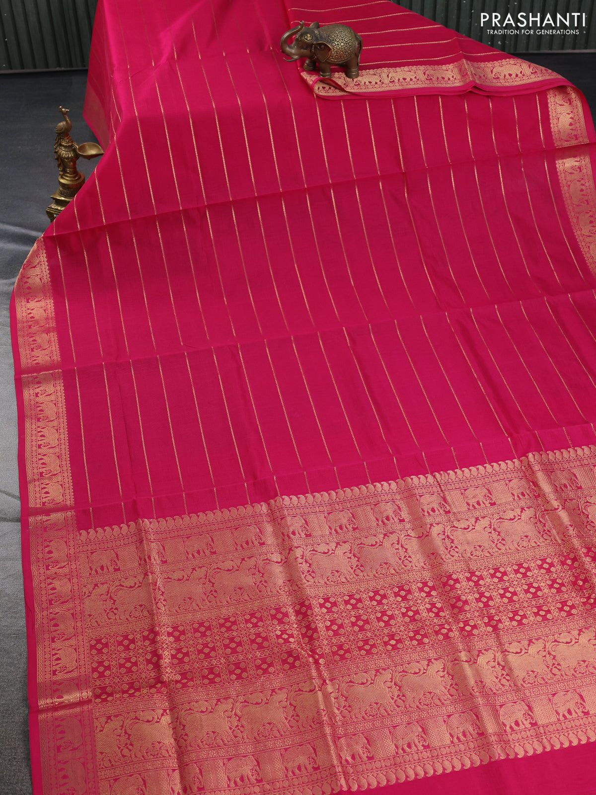 Kanchipuram silk cotton saree pink with allover zari stripe pattern and elephant zari woven border