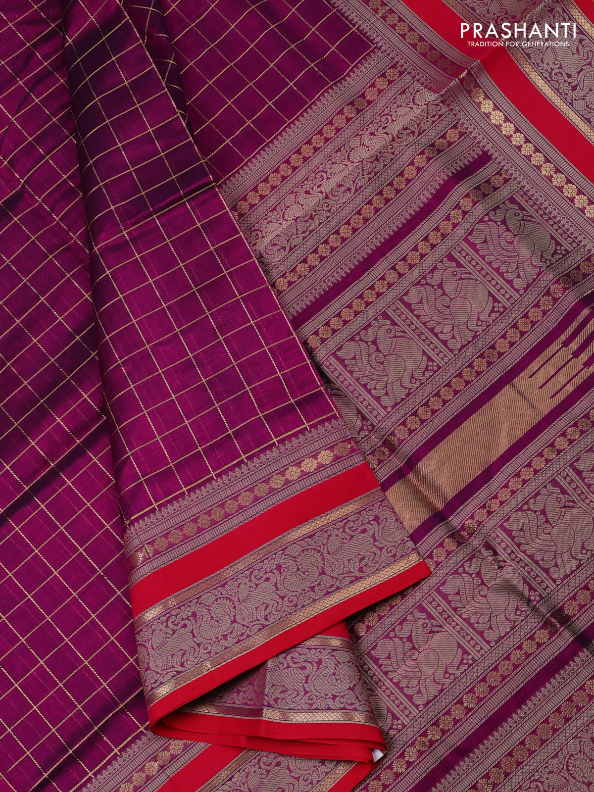 Kanchipuram silk cotton saree purple and pink with allover zari checked pattern and thread woven border