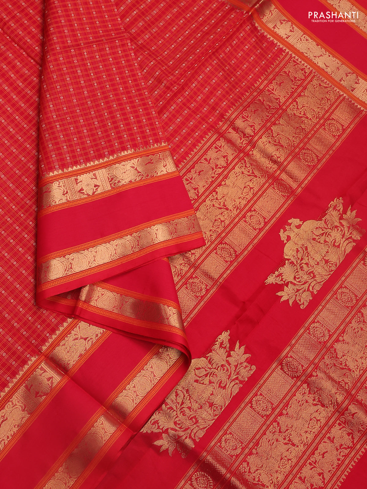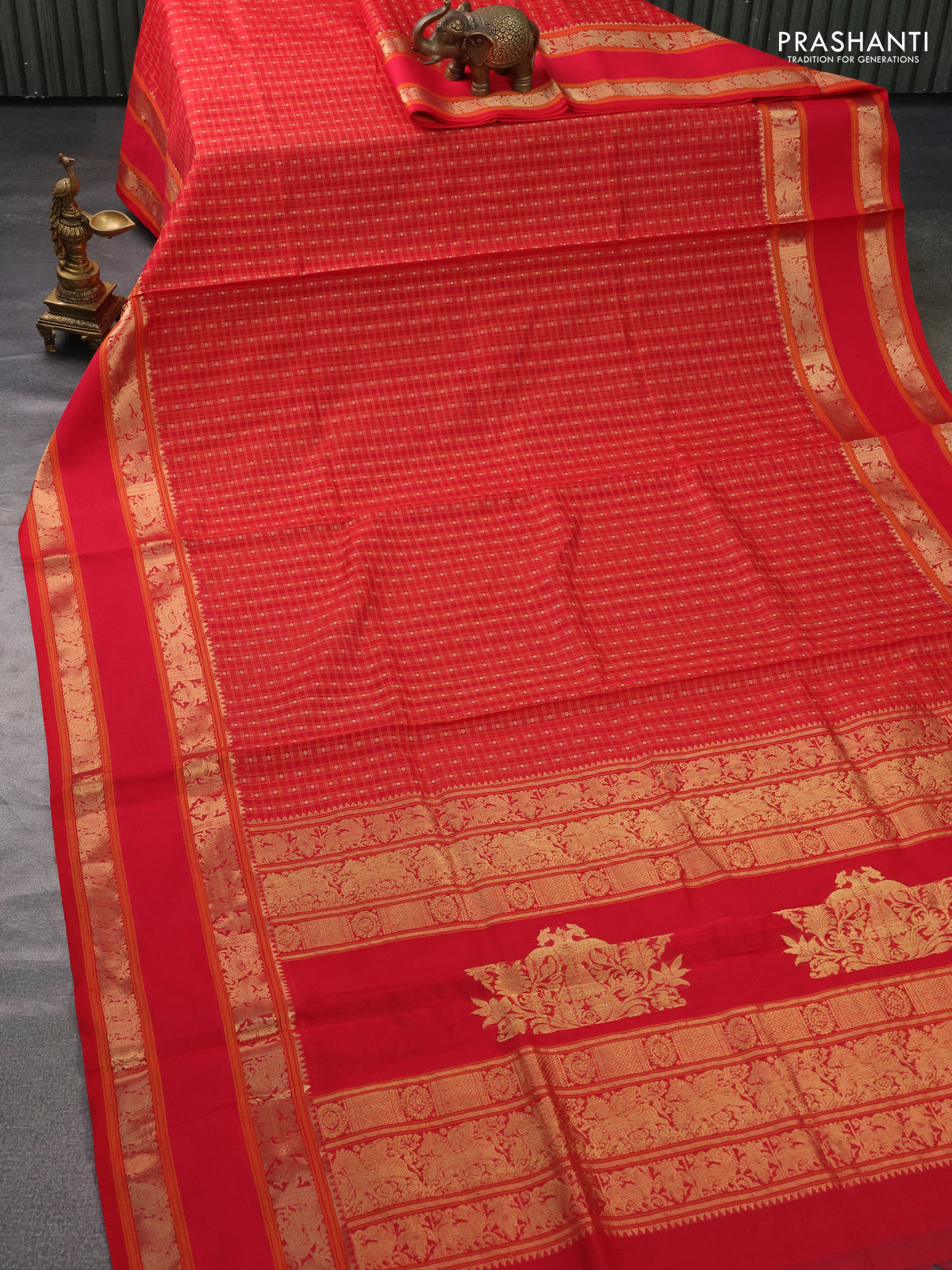 Kanchipuram silk cotton saree red with allover thread woven checked pattern & buttas and rettapet zari woven border