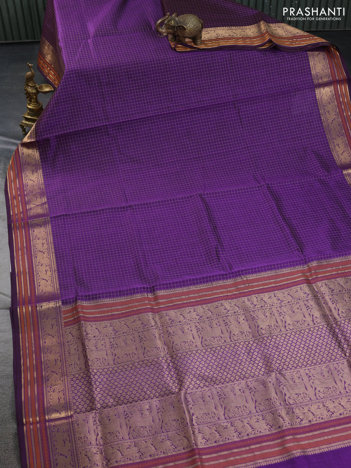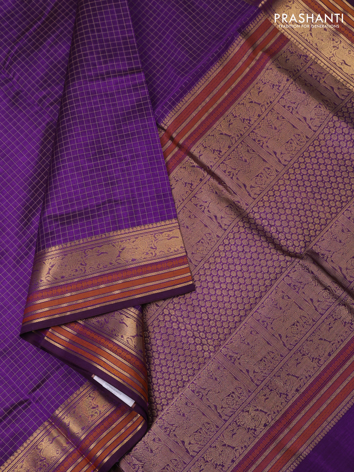 Kanchipuram silk cotton saree violet with allover checked pattern and zari woven border