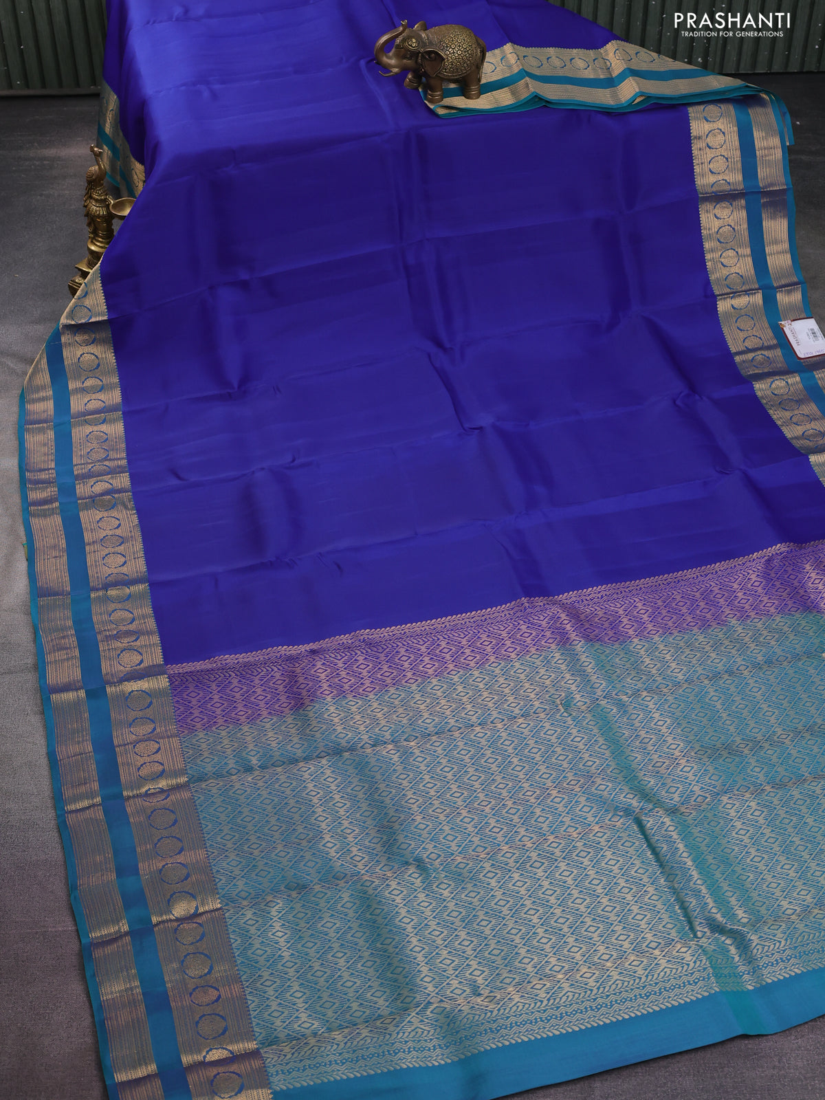 Kanchipuram silk saree blue and dual shade of teal green with plain body and rettapet zari woven border
