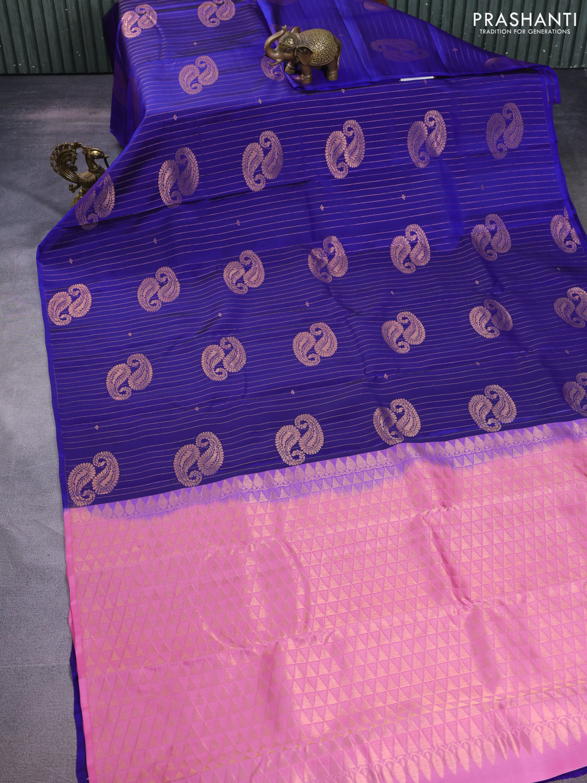 Kanchipuram silk saree blue and light pink with allover zari weaves in borderless style