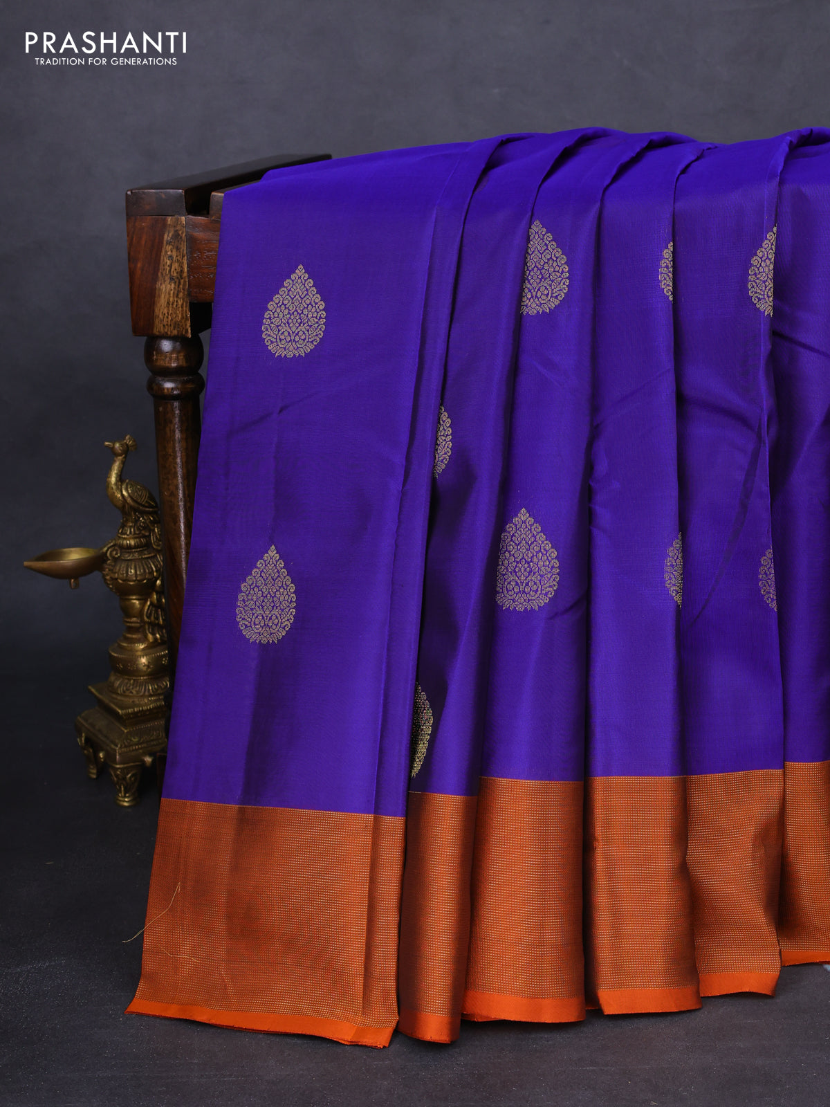 Kanchipuram silk saree blue and rustic orange with zari woven buttas and zari woven border