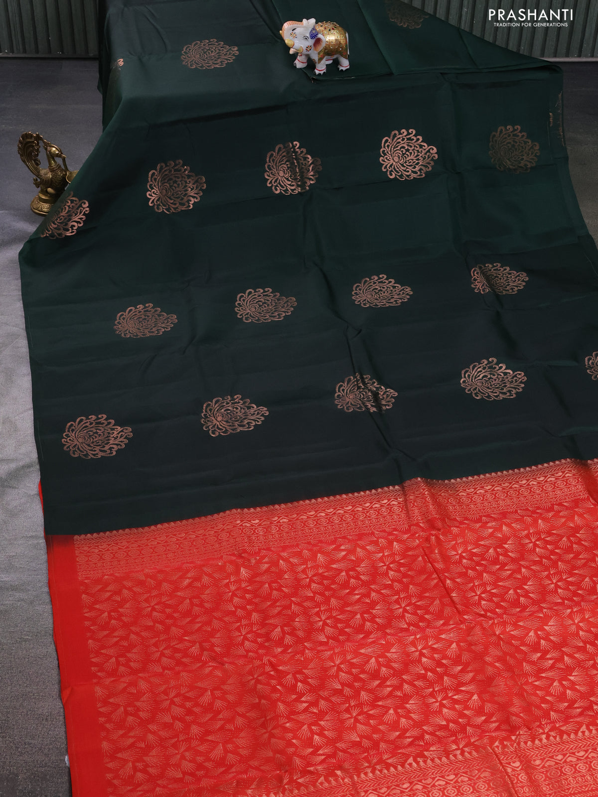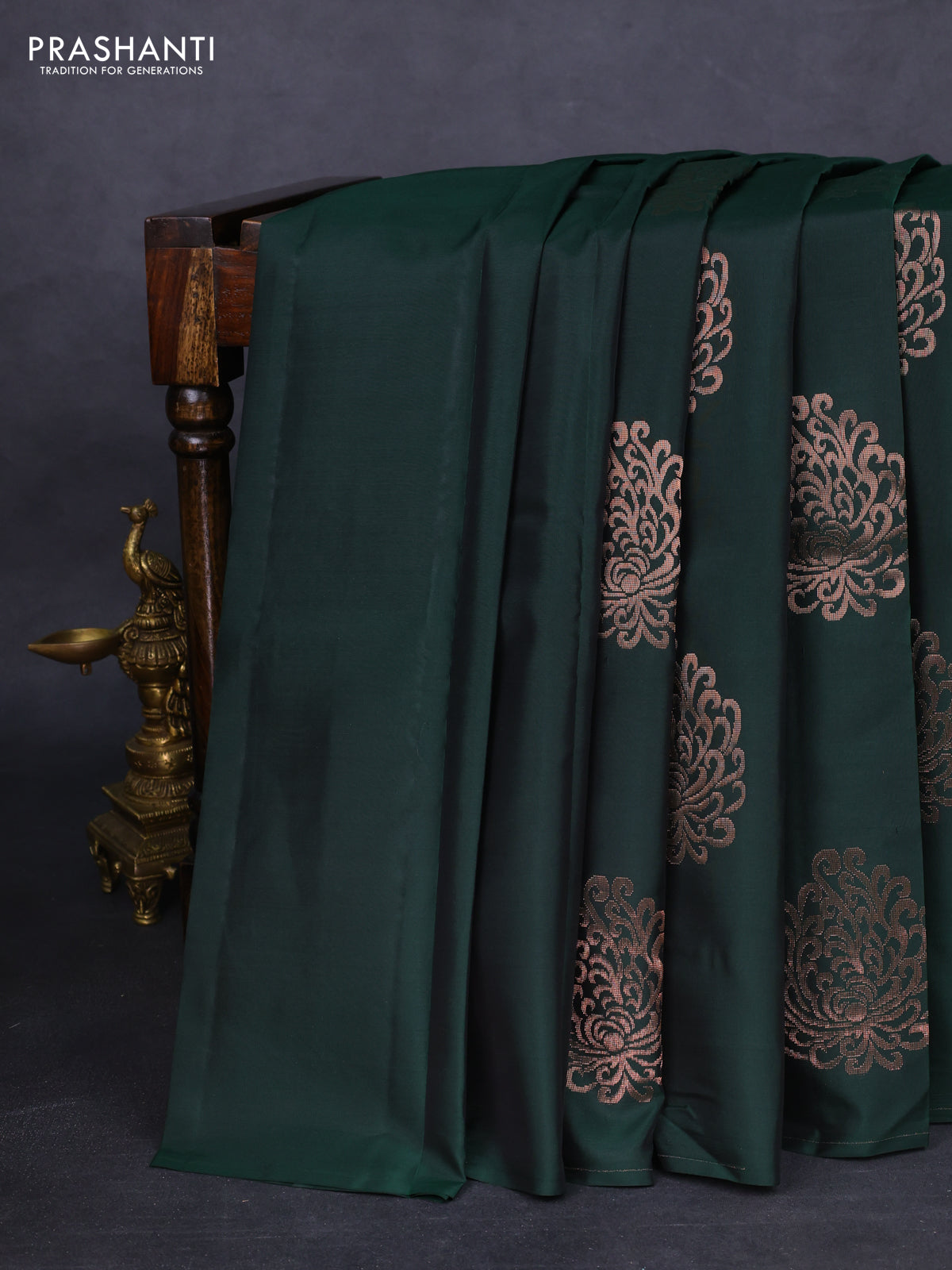 Kanchipuram silk saree bottle green and orange with copper zari woven buttas in borderless style