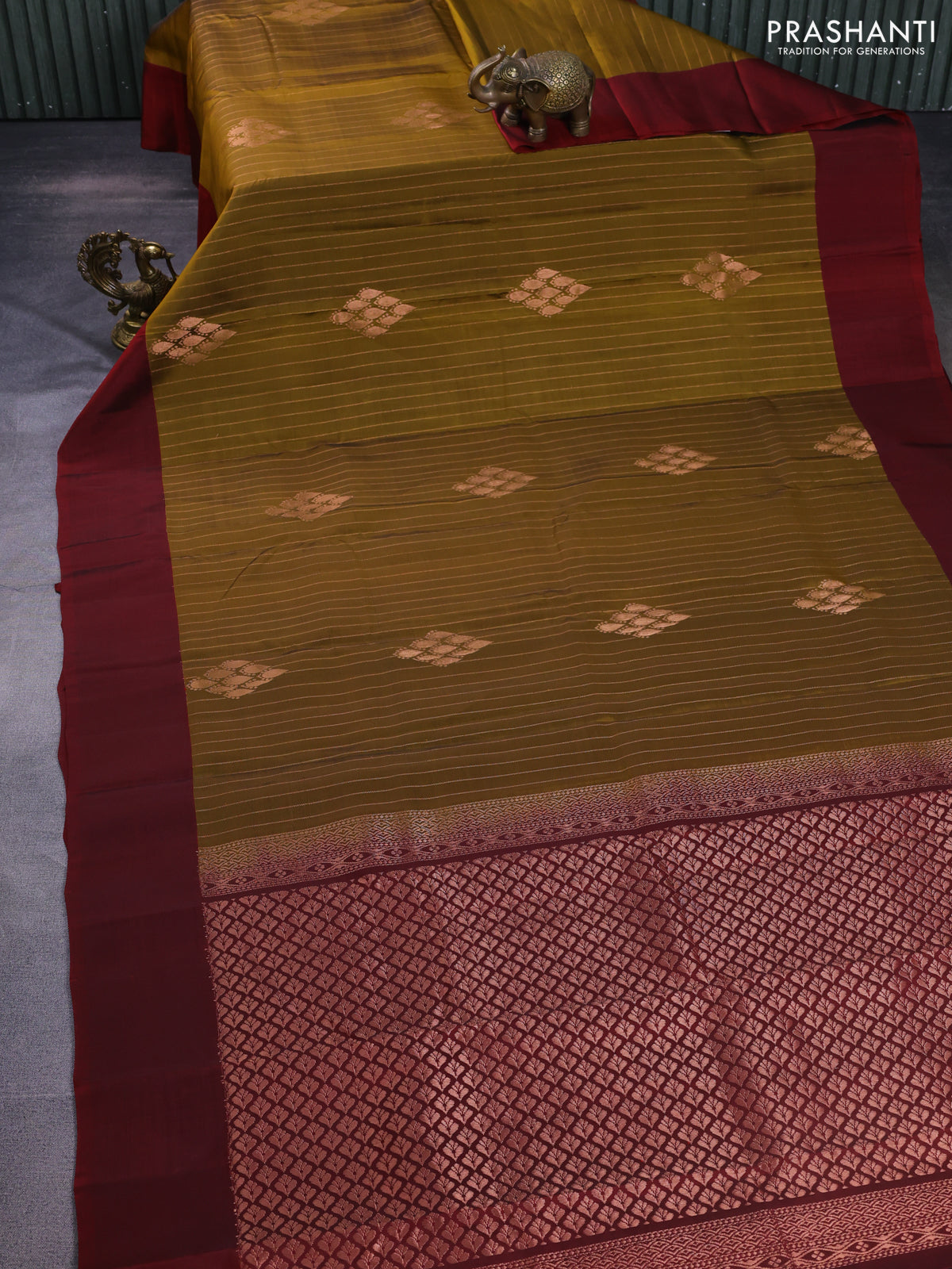 Kanchipuram silk saree dark mehendi green and maroon with allover zari weaves and simple border