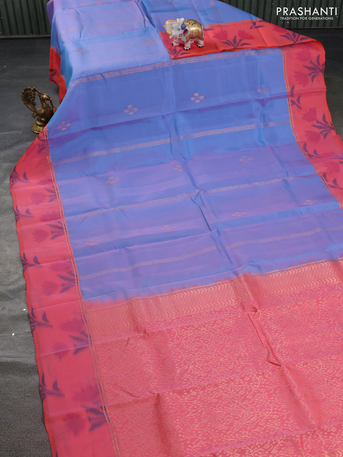 Kanchipuram silk saree dual shade of blue and peach shade with copper zari weaves & buttas and copper zari woven ikat style border