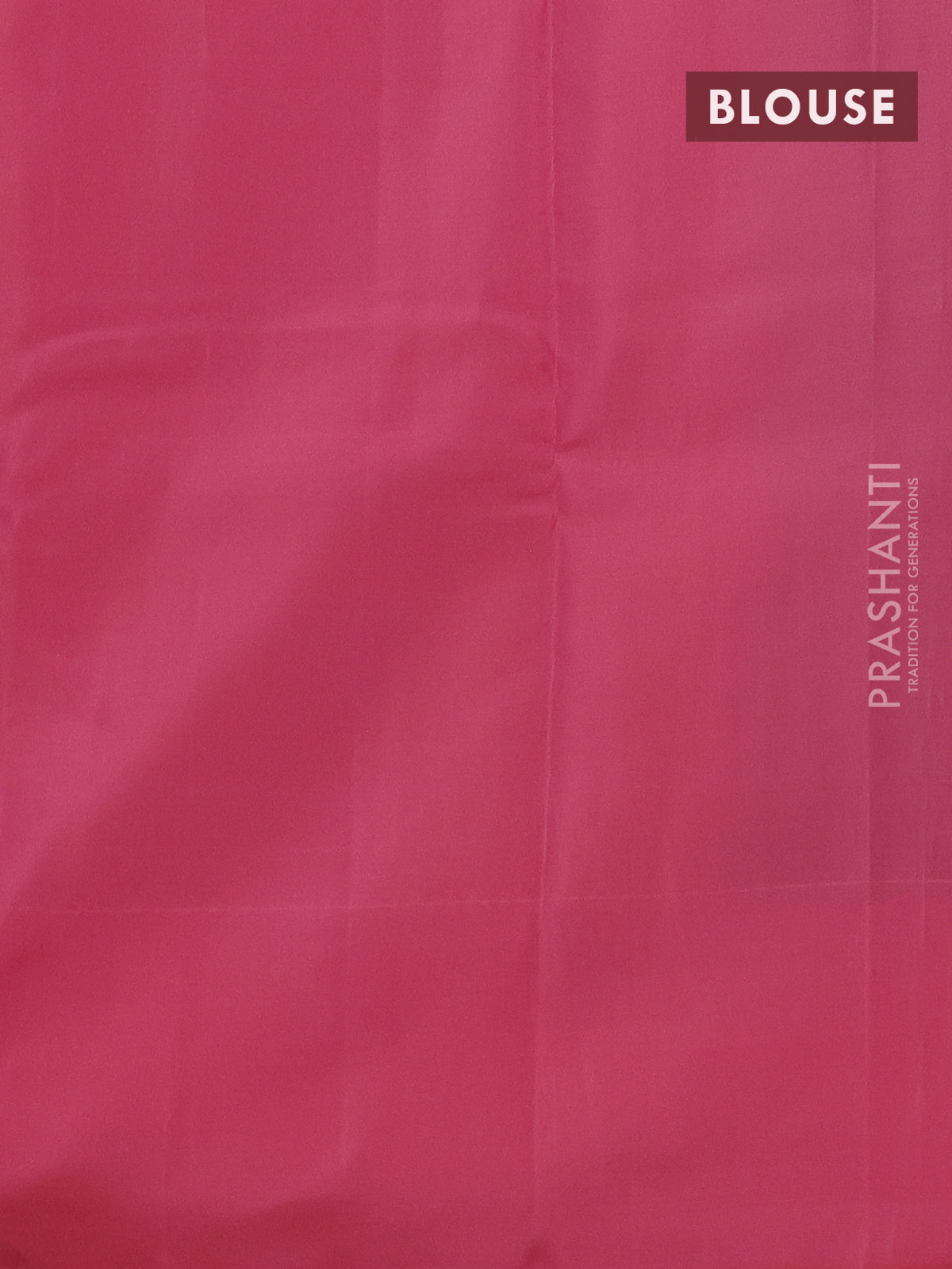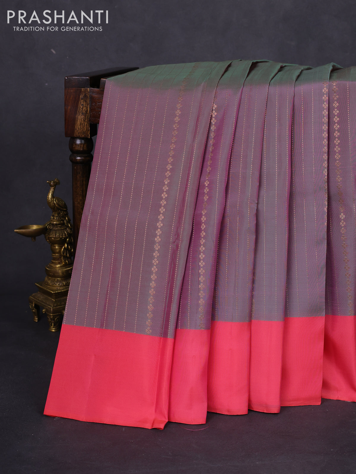 Kanchipuram silk saree dual shade of greenish pink and peach pink with allover copper zari weaves and simple border