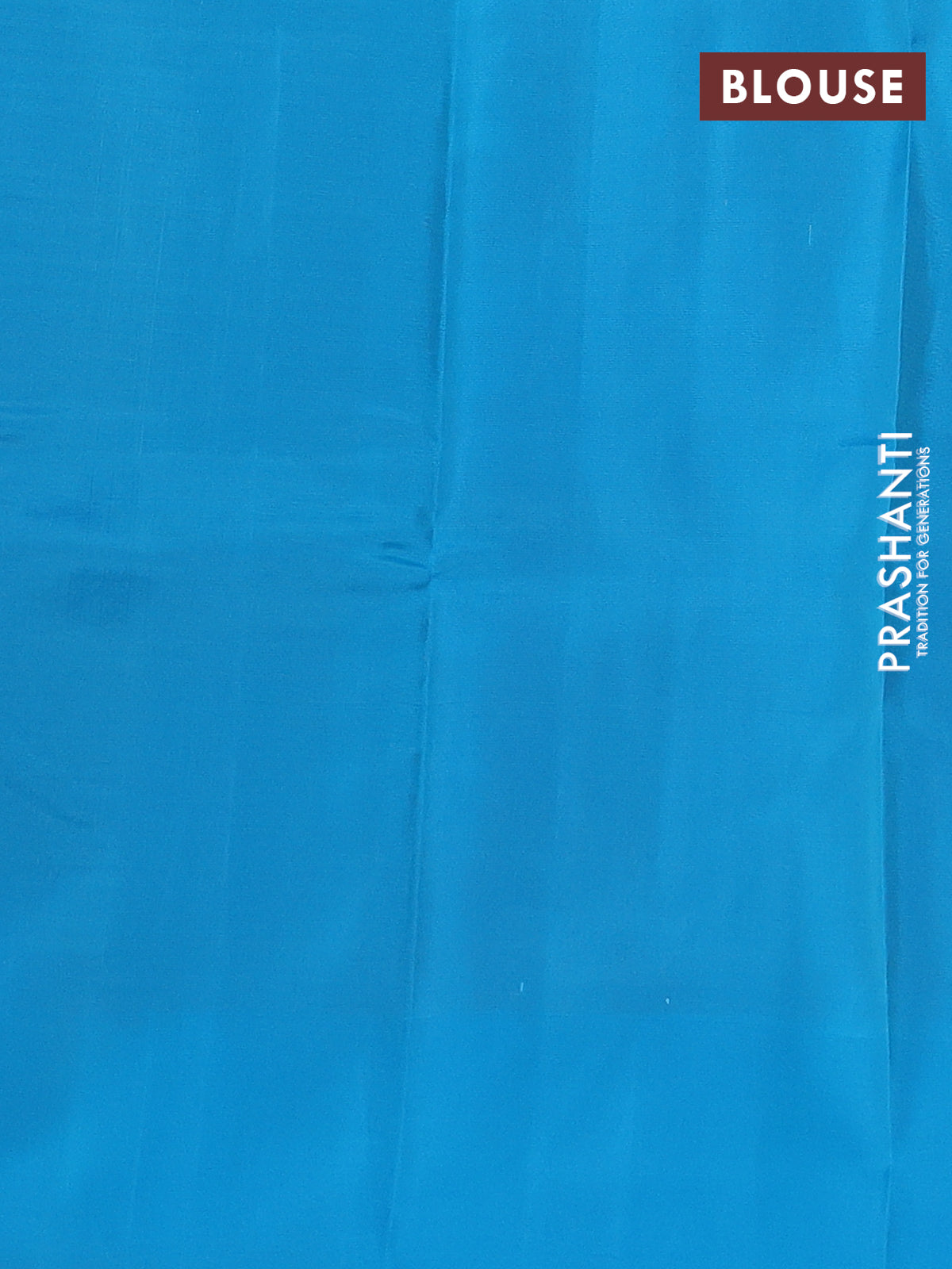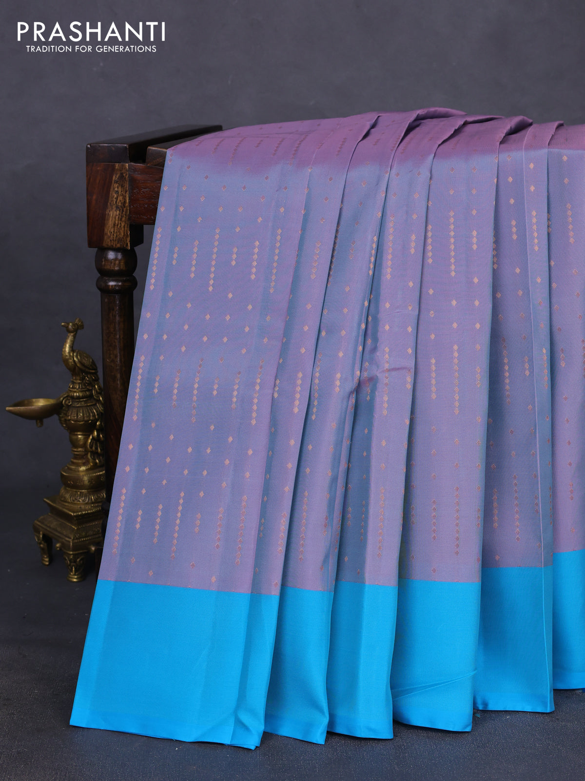 Kanchipuram silk saree dual shade of pastel pink and teal blue with allover copper zari woven butta weaves and simple border