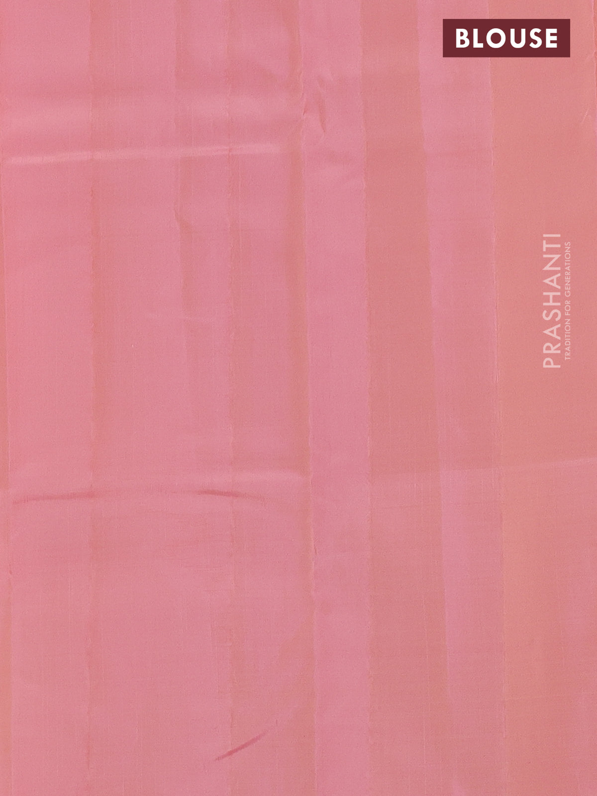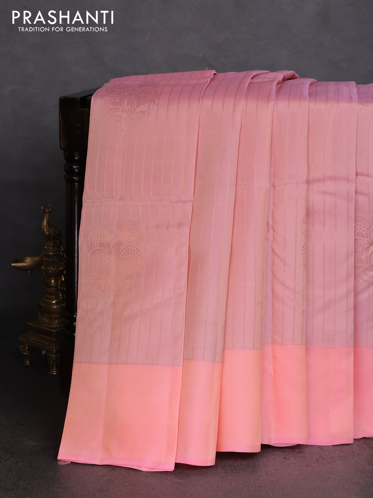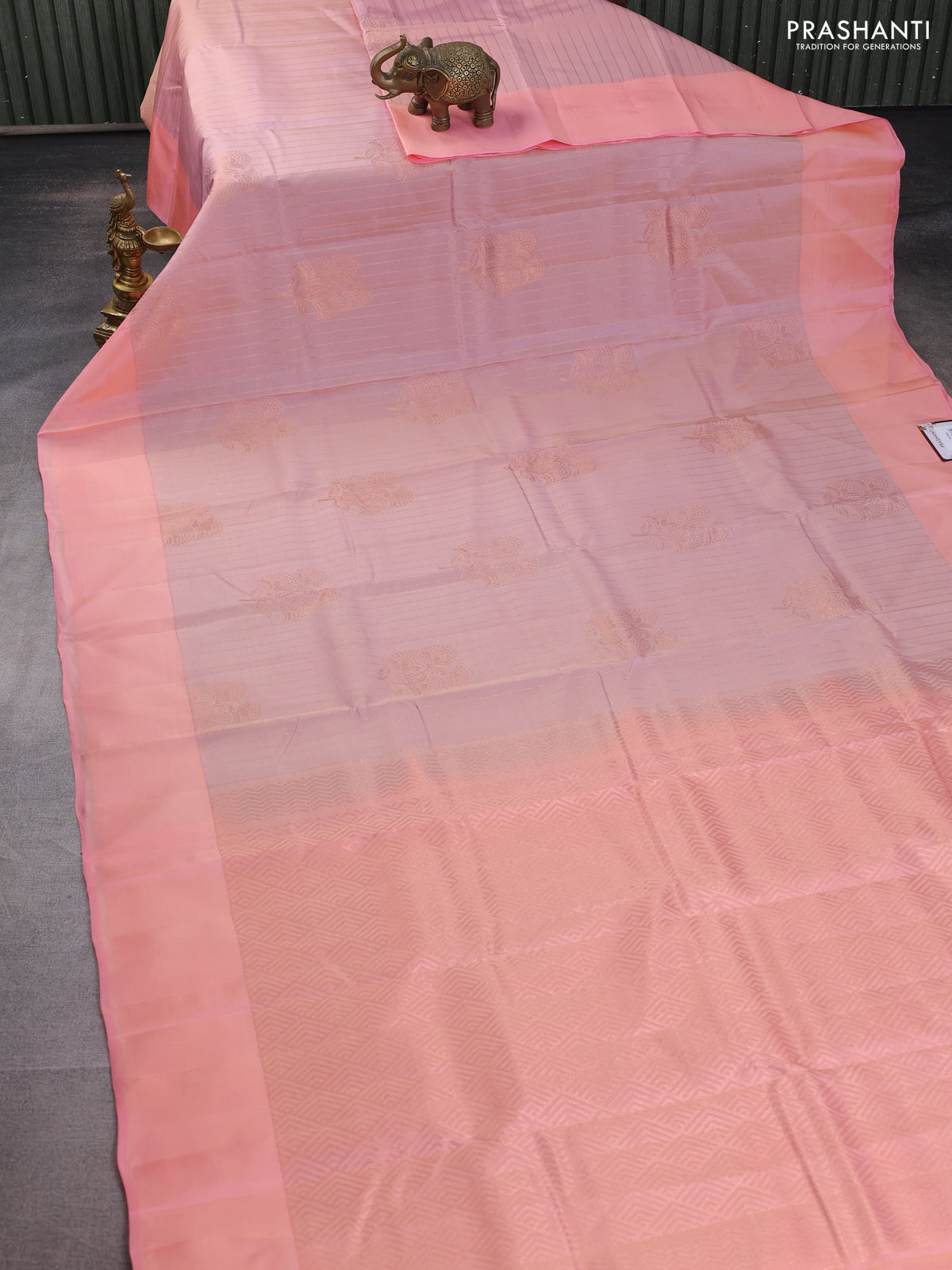 Kanchipuram silk saree dual shade of peach and pieach pink with allover copper zari weaves and simple border