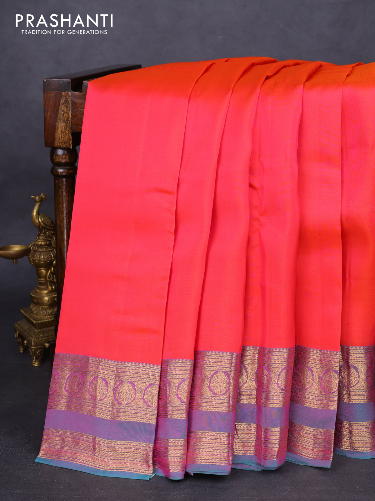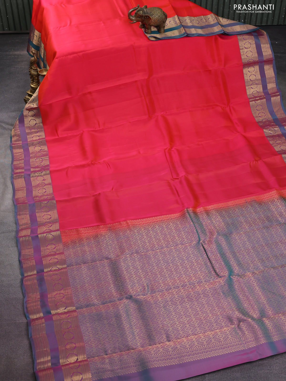 Kanchipuram silk saree dual shade of pink and dual shade of teal green with plain body and rettapet zari woven border