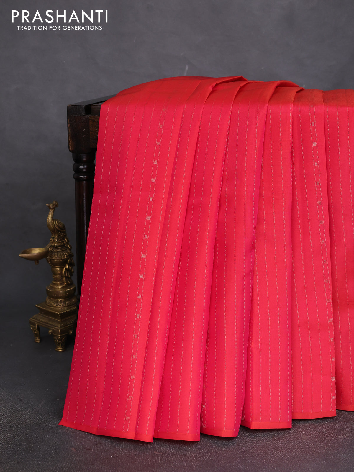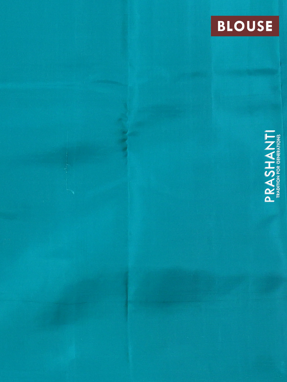 Kanchipuram silk saree dual shade of pinkish orange and teal blue with allover zari weaves in borderless style