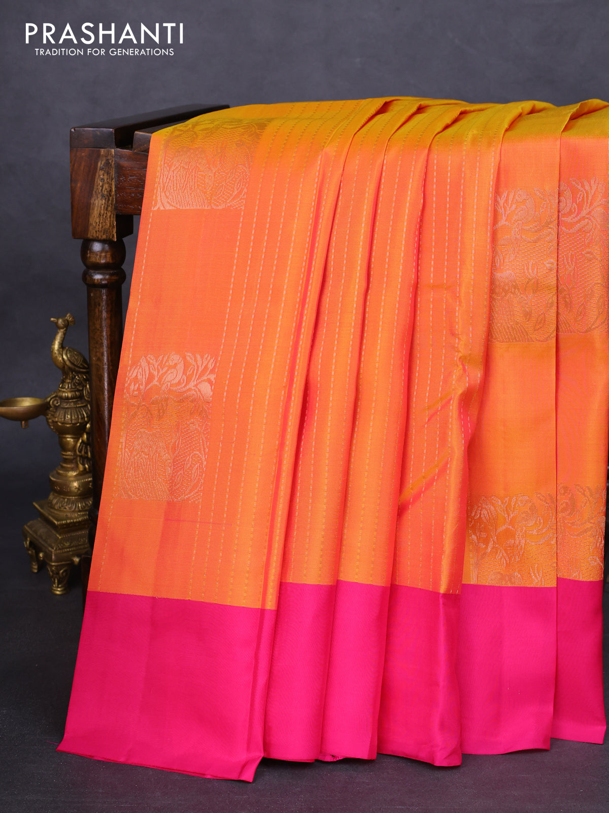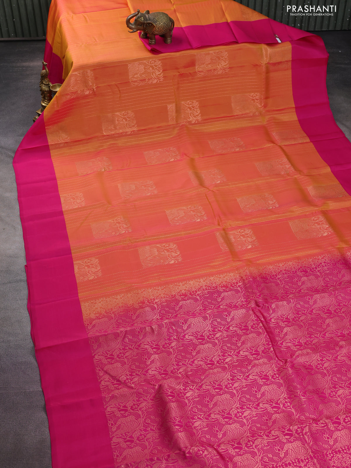Kanchipuram silk saree dual shade of yellowish pink and pink with allover zari weaves & buttas and simple border
