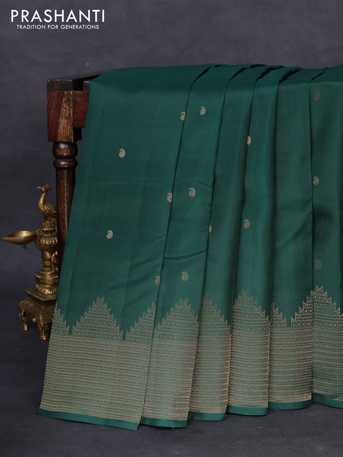 Kanchipuram silk saree green with zari woven buttas and temple design zari woven border