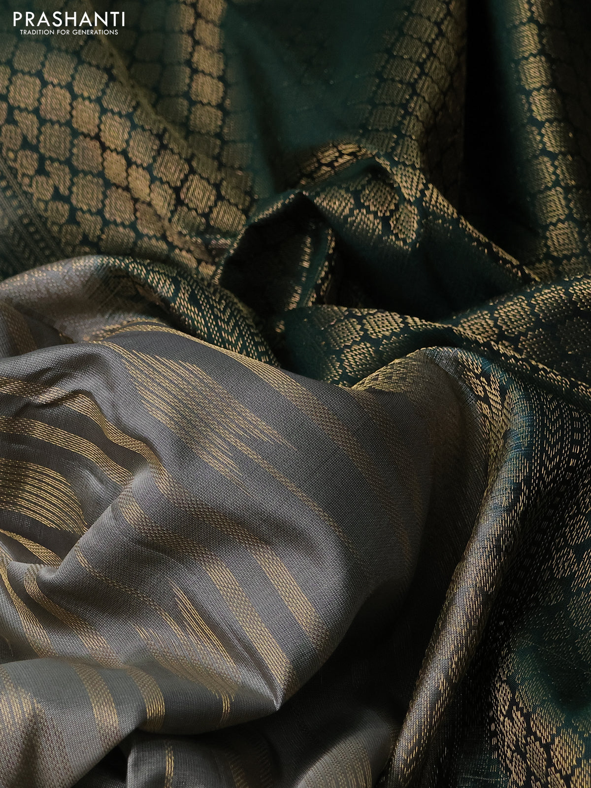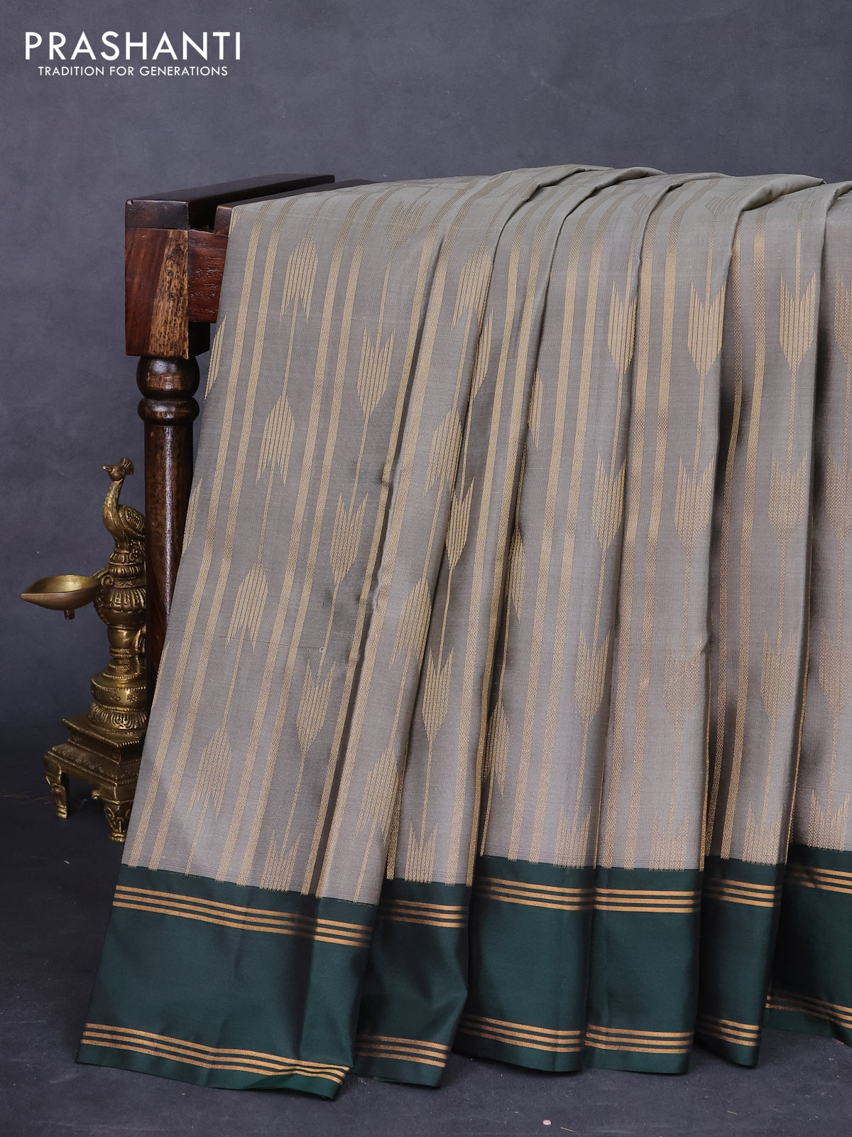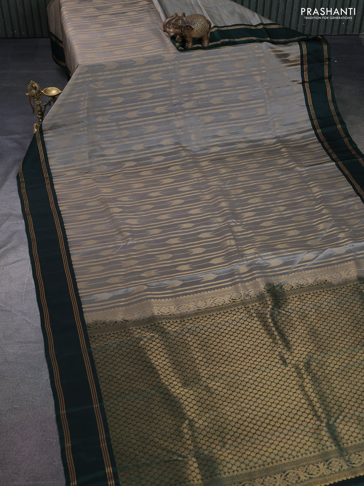 Kanchipuram silk saree grey and dark green with allover zari weaves and rettapet zari woven border