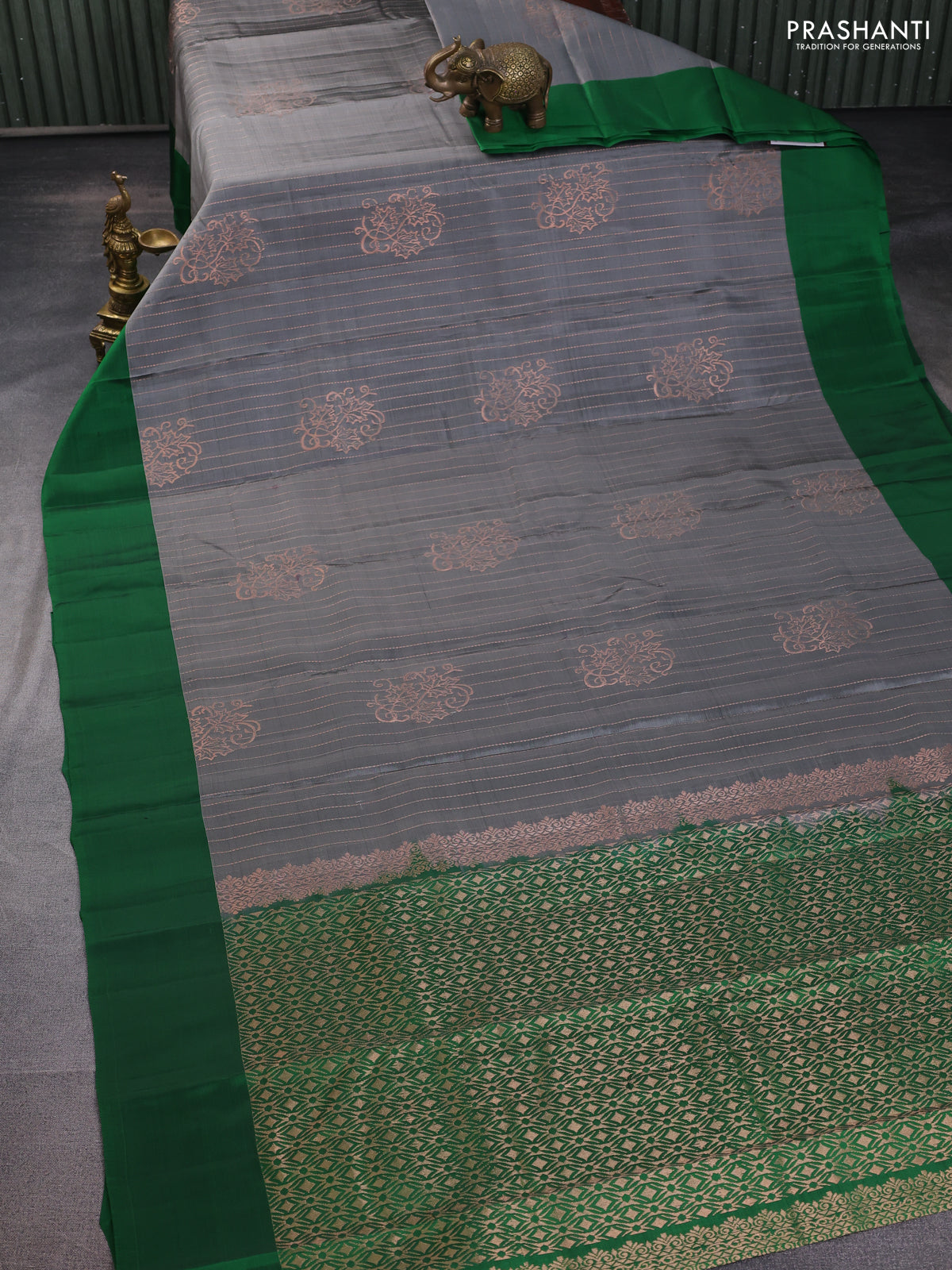Kanchipuram silk saree grey and green with allover copper zari weaves and simple border