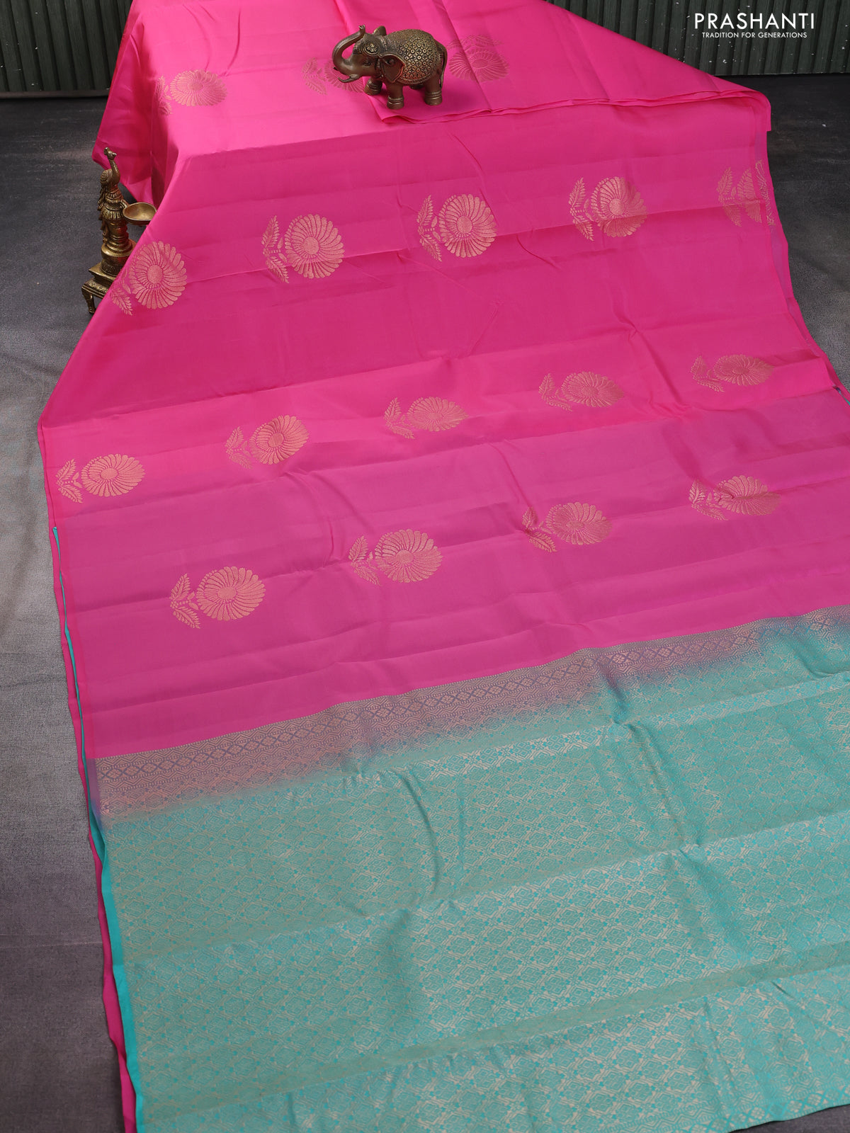 Kanchipuram silk saree light pink and teal green with copper zari woven floral buttas in borderless style