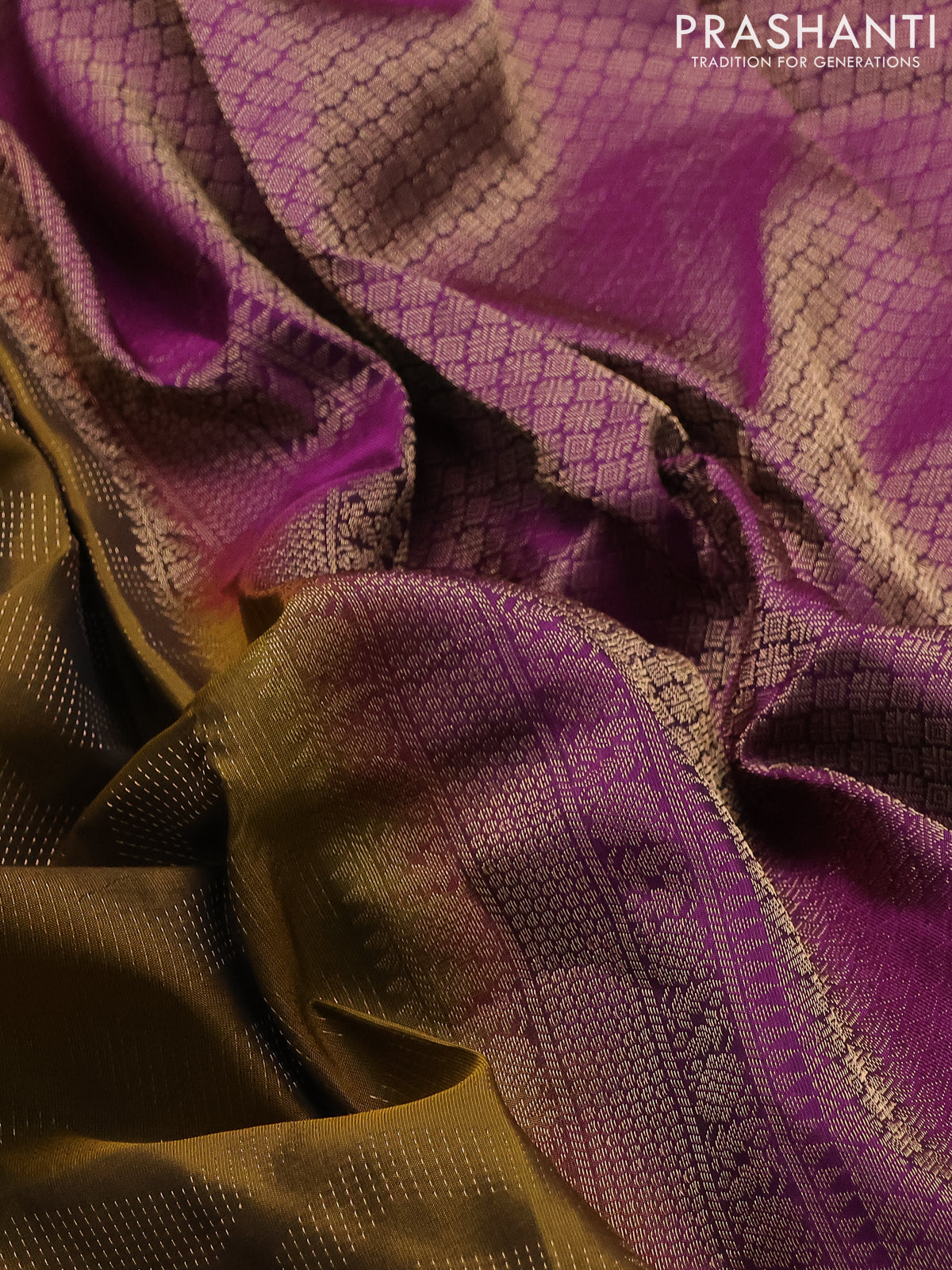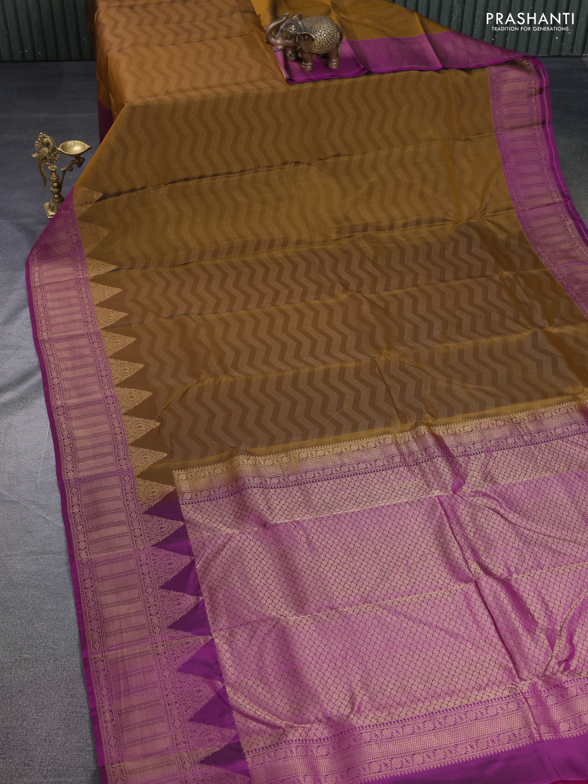 Kanchipuram silk saree mustard green and purple with allover zari weaves and zari woven border