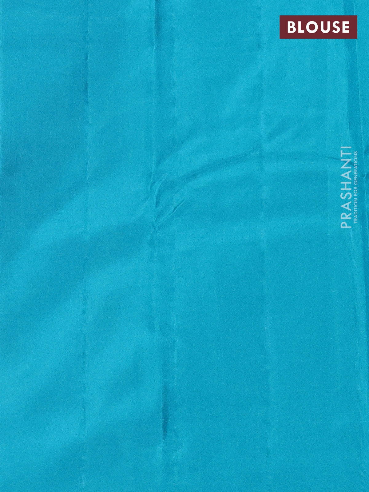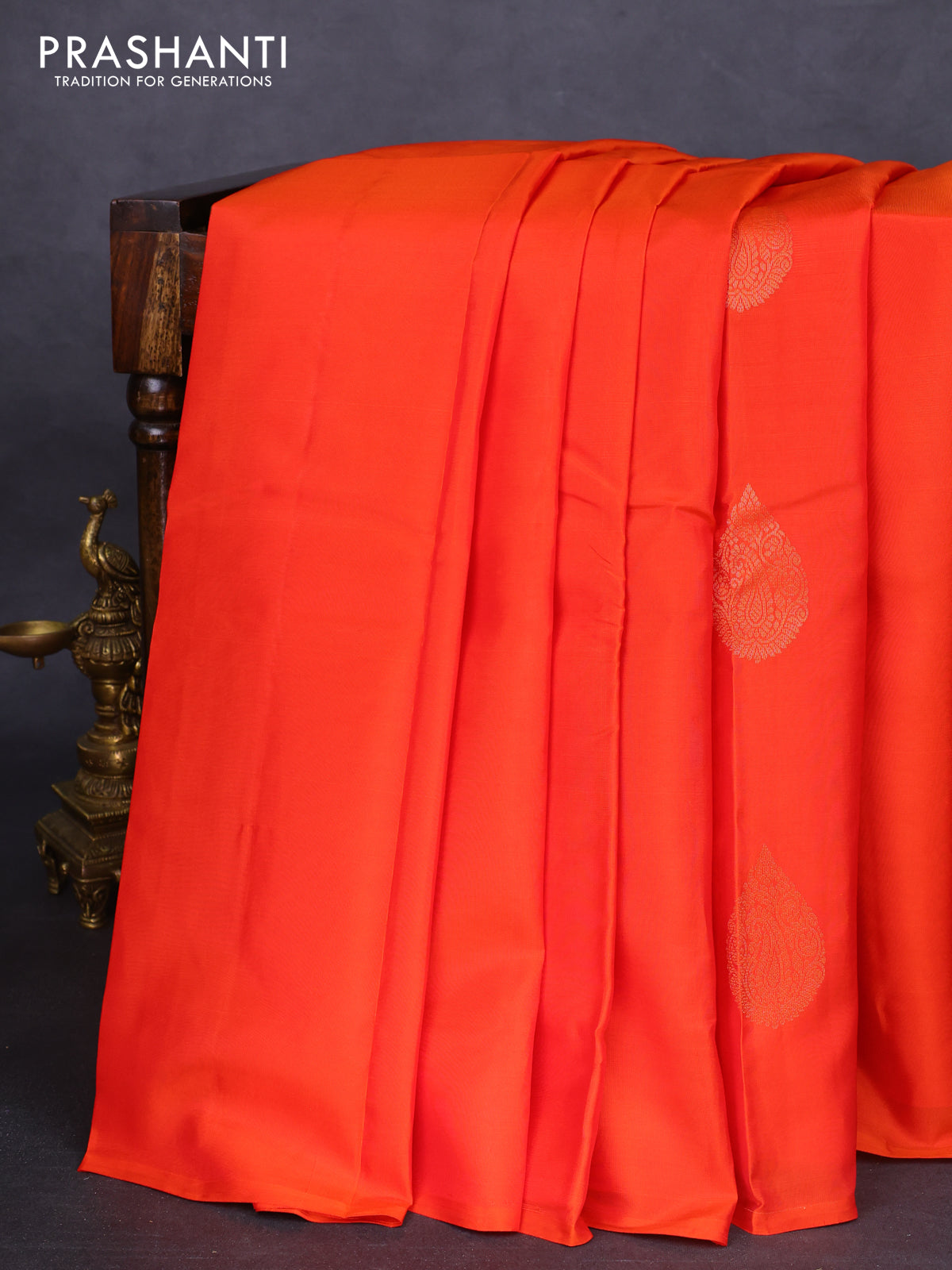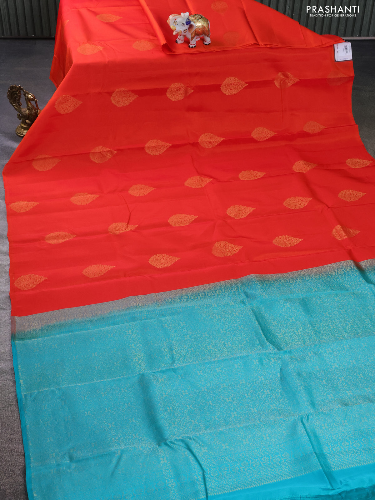 Kanchipuram silk saree orange and teal blue with zari woven buttas in borderless style