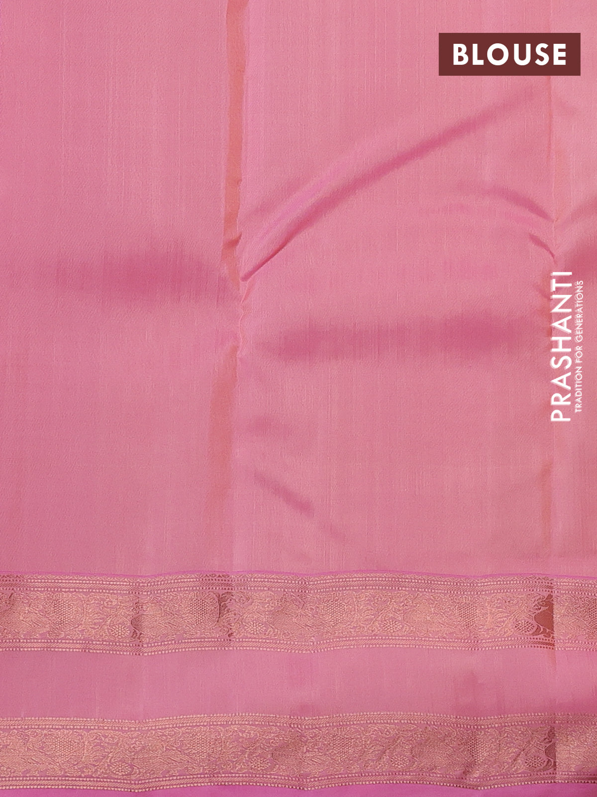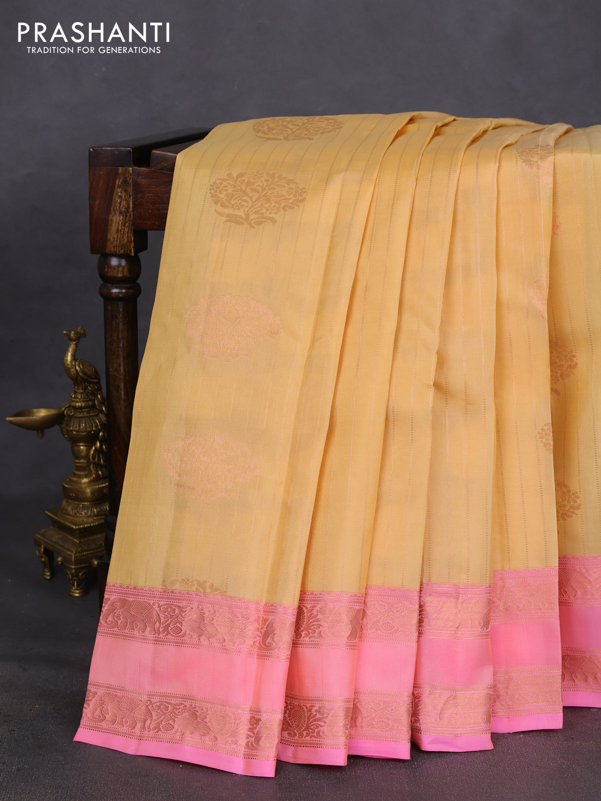 Kanchipuram silk saree pale yellow and light pink with allover copper zari weaves & buttas and copper rettapet zari woven border