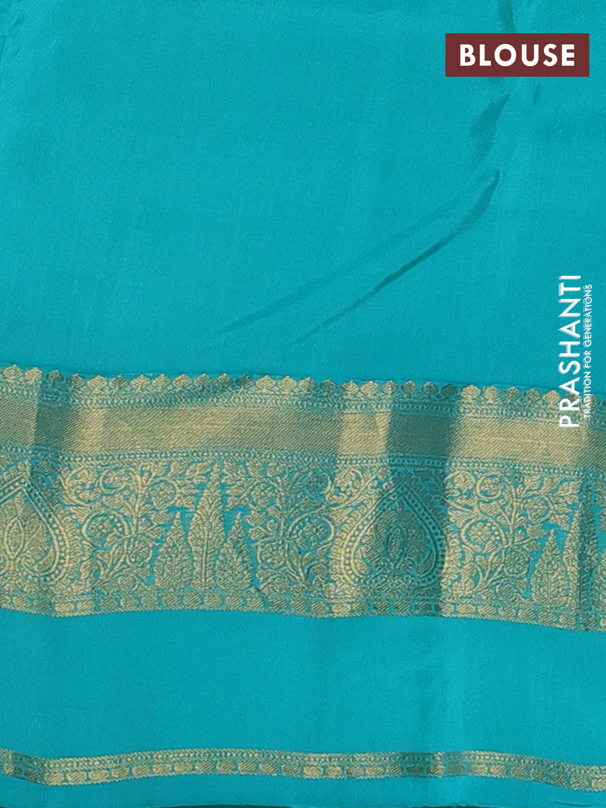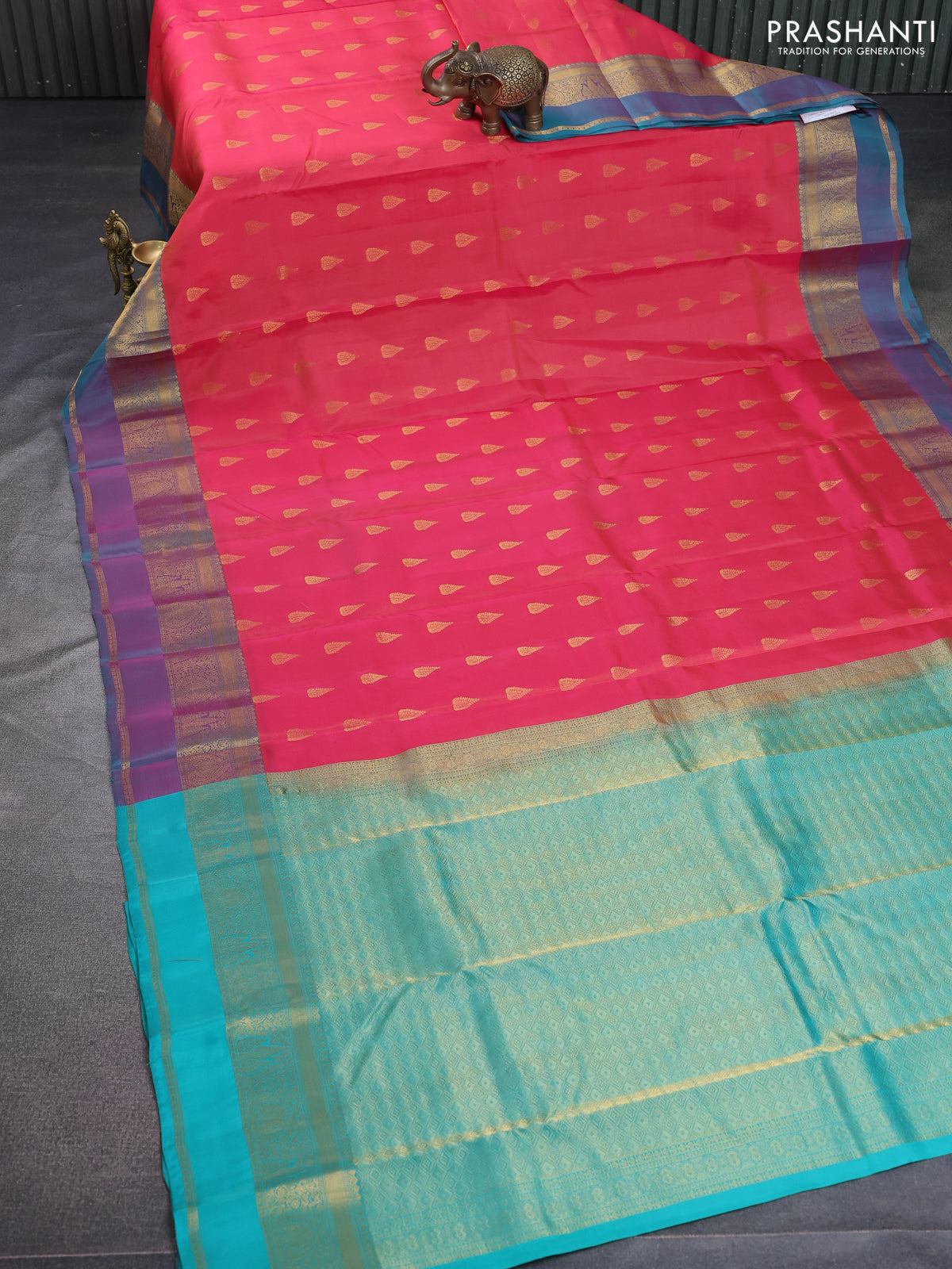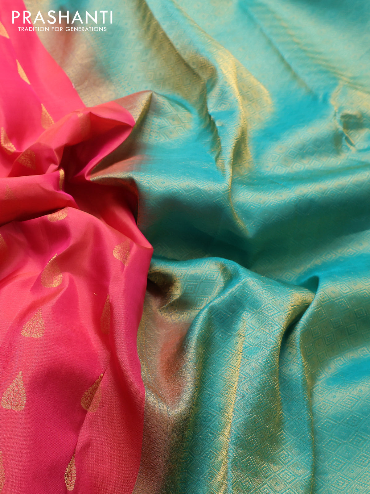 Kanchipuram silk saree peach pink and dual shade of teal green with zari woven buttas and zari woven border