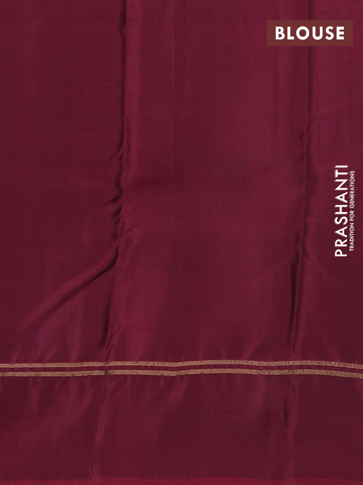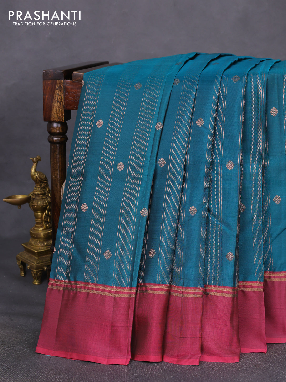 Kanchipuram silk saree peacock blue and dark magenta pink with allover copper zari weaves and copper zari woven simple border