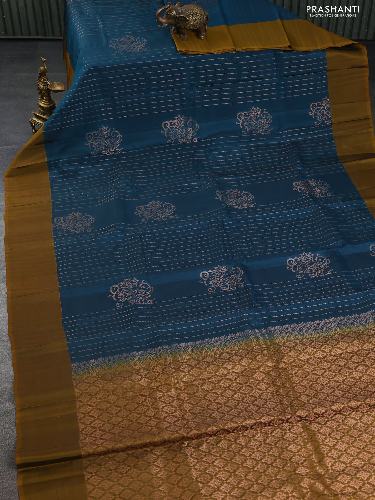 Kanchipuram silk saree peacock blue and dark mustard with allover copper zari weaves and simple border