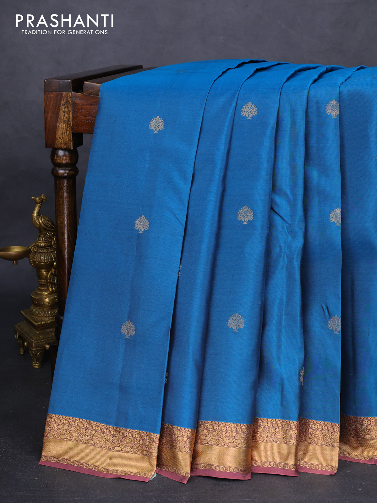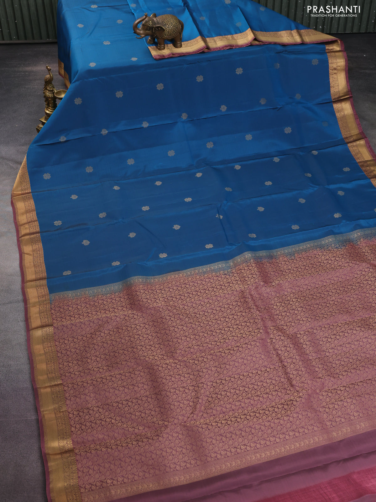 Kanchipuram silk saree peacock blue and mauve pink with zari woven buttas and zari woven border