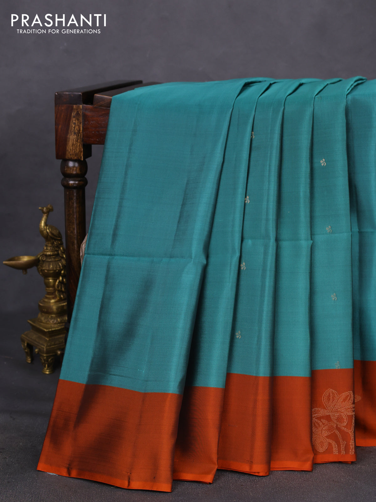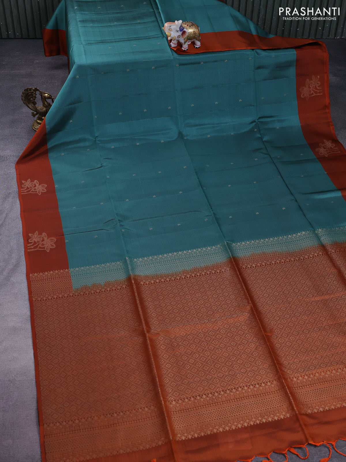 Kanchipuram soft silk saree peacock green and orange with zari woven buttas and zari woven butta border