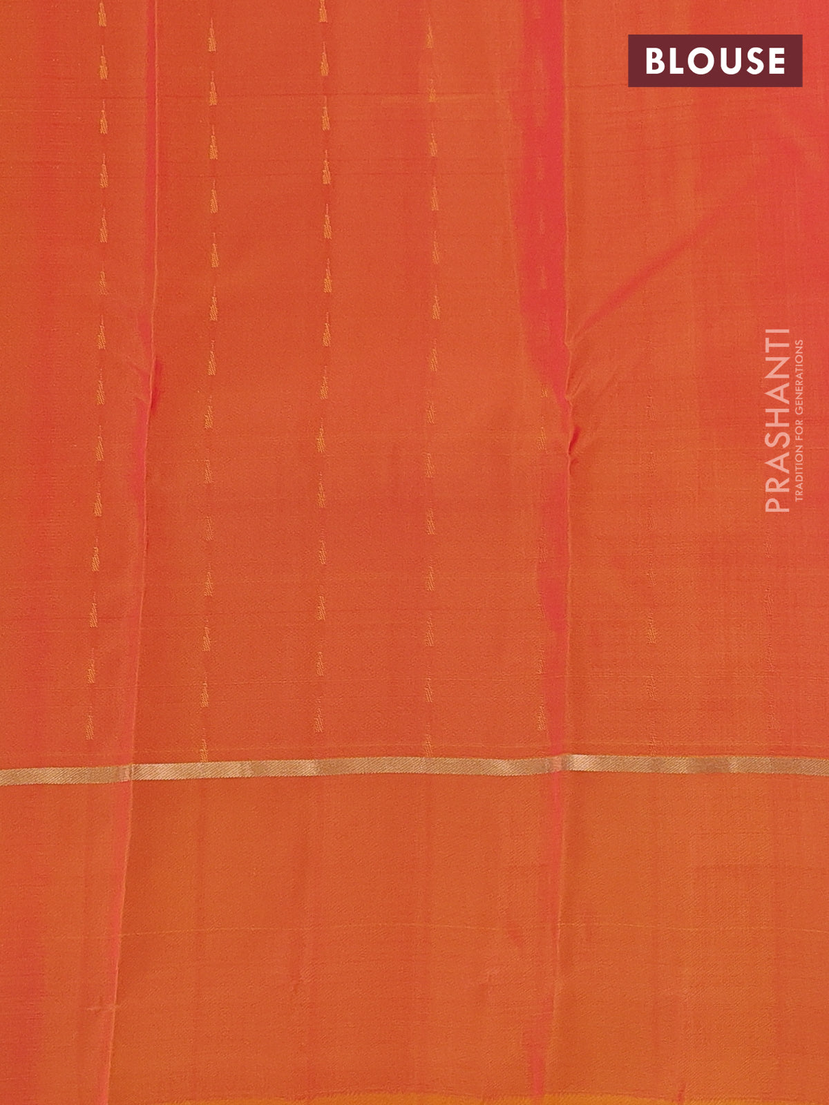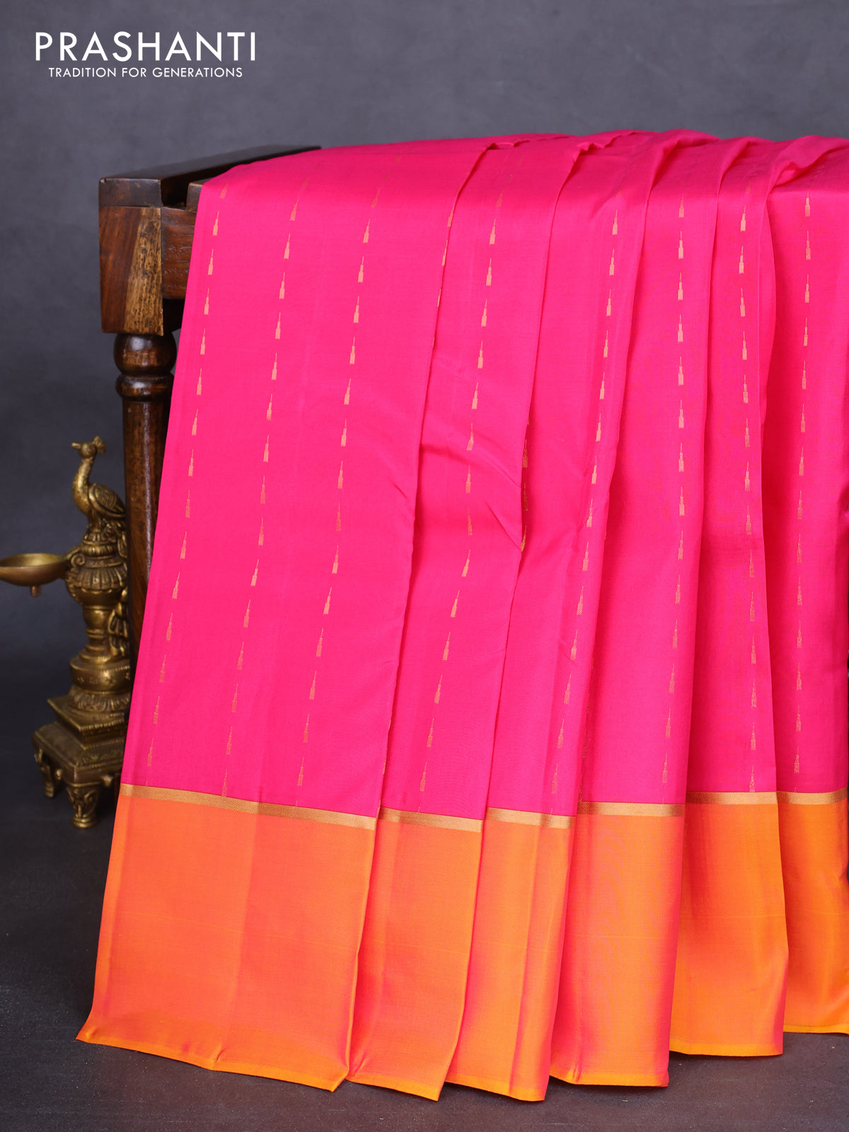 Kanchipuram silk saree pink and dual shade of yellow with allover zari woven temple buttas and zari woven simple border