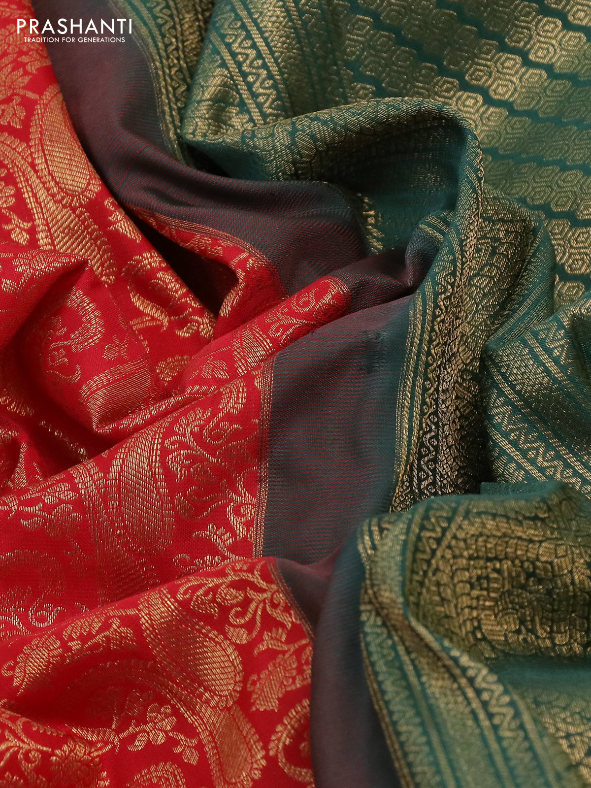 Kanchipuram silk saree red and green shade with allover zari woven brocade weaves and long rich zari woven border