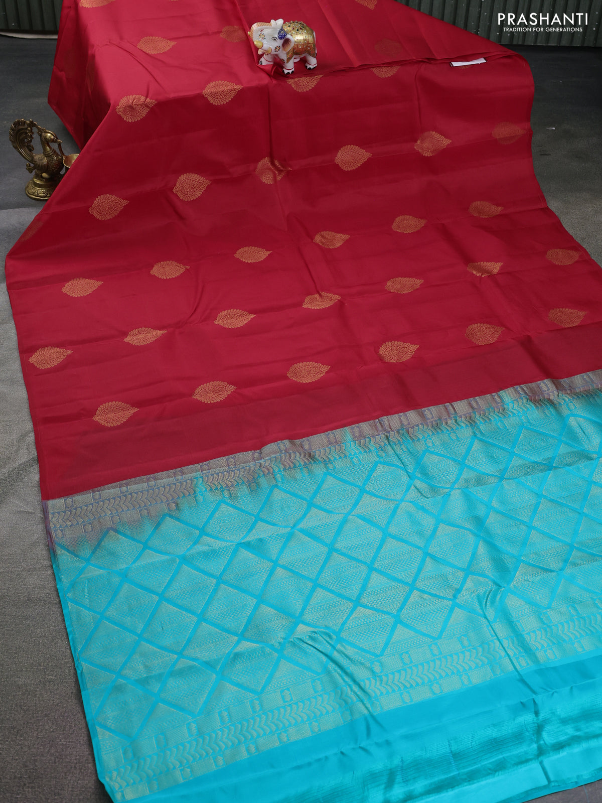 Kanchipuram silk saree red and teal blue with zari woven buttas in borderless style