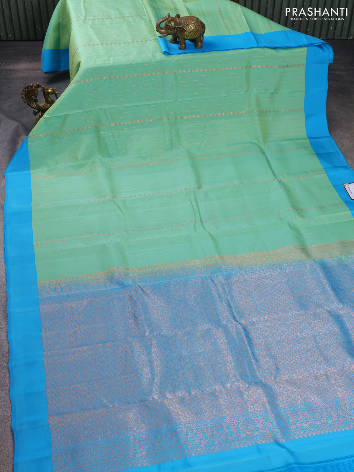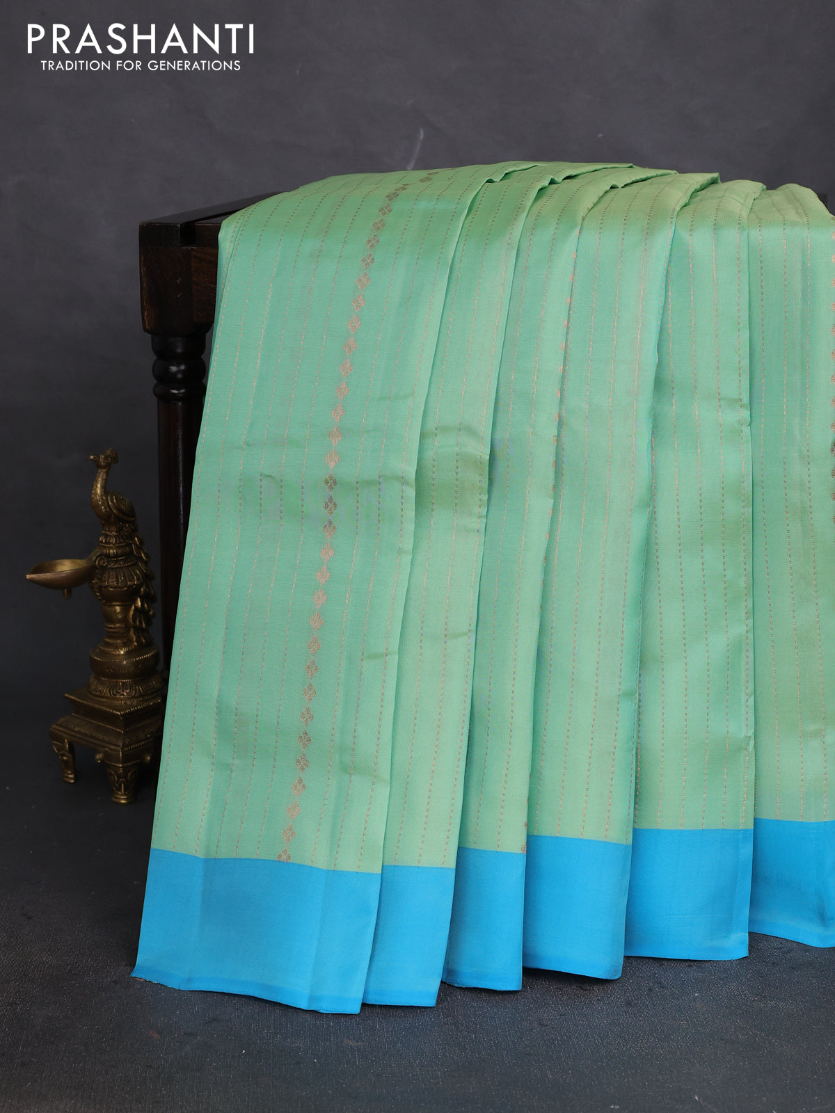 Kanchipuram silk saree teal green shade and blue with allover copper zari weaves and simple border