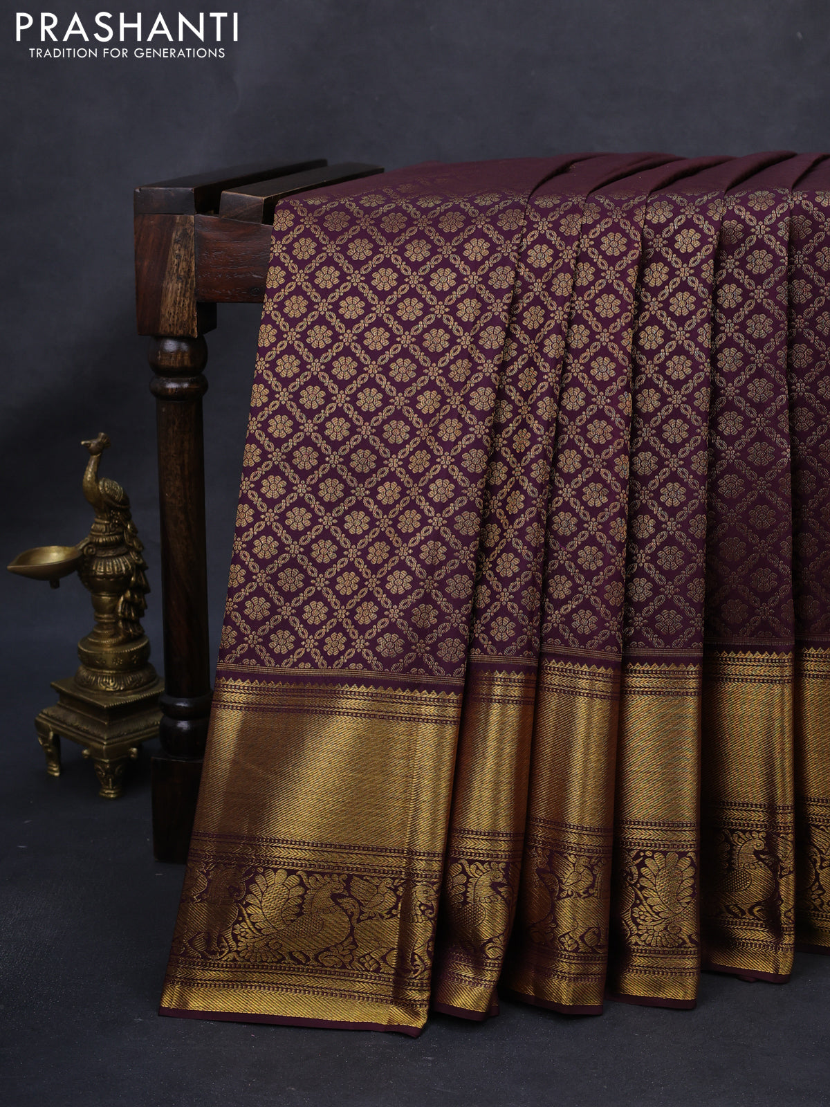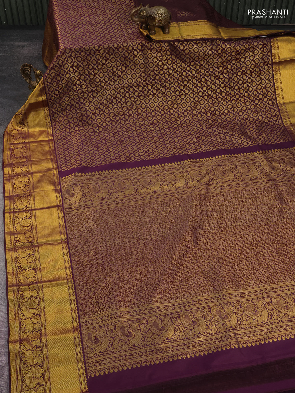 Kanchipuram silk saree wine shade with allover zari woven brocade weaves and long rich zari woven border