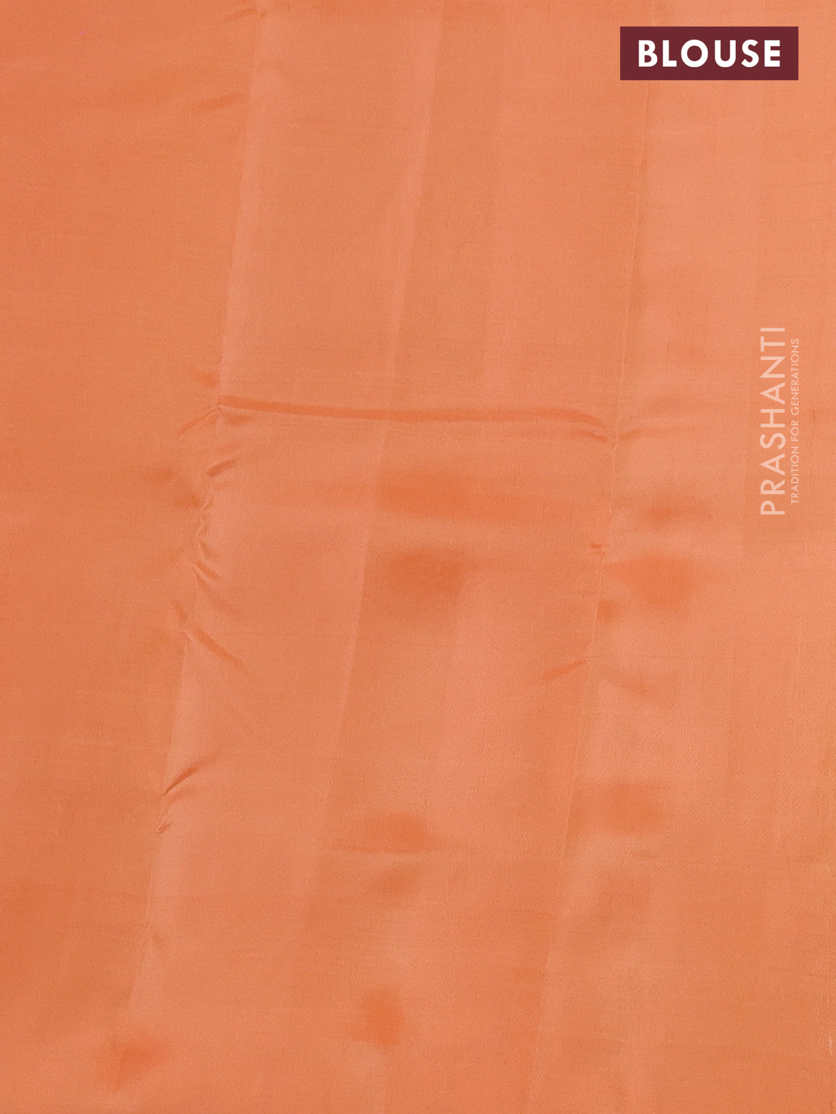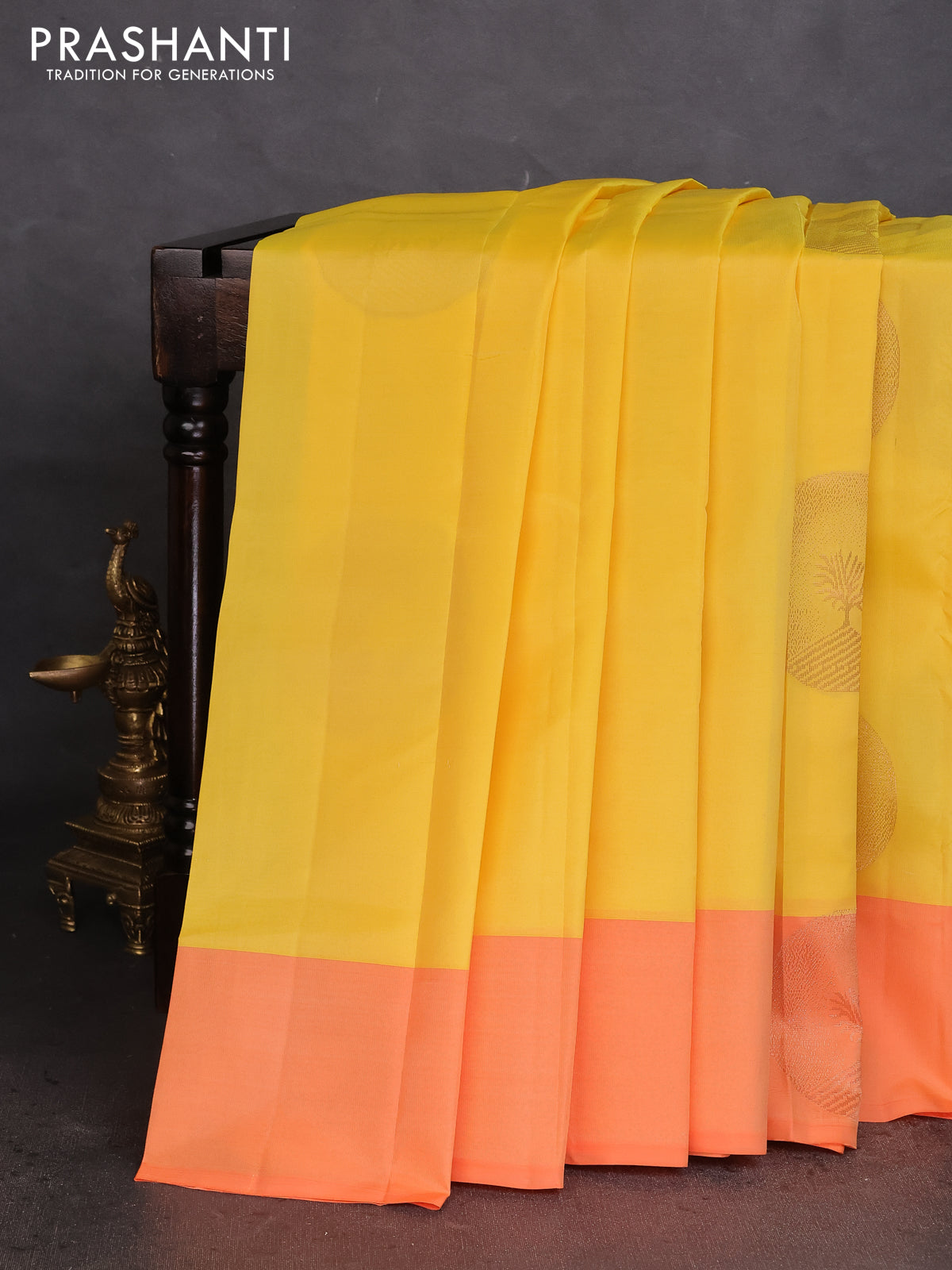 Kanchipuram silk saree yellow and orange with coppper zari woven buttas and simple border