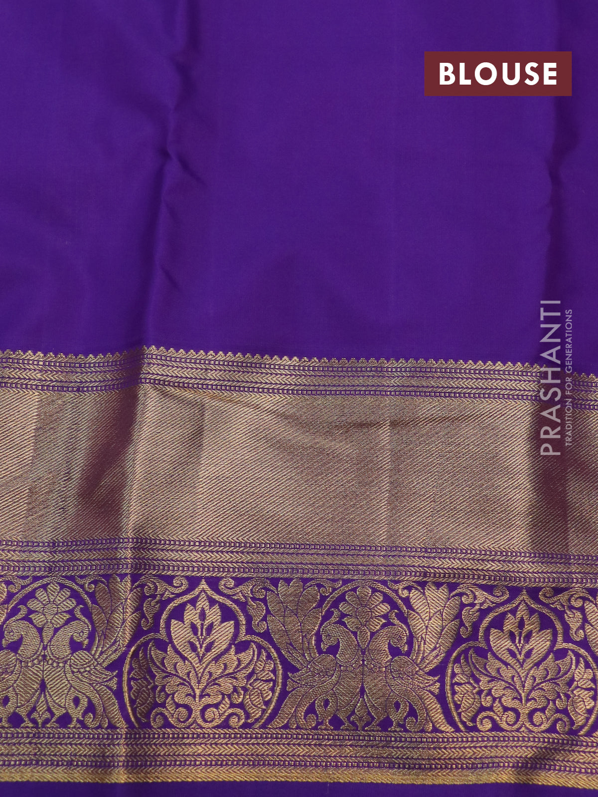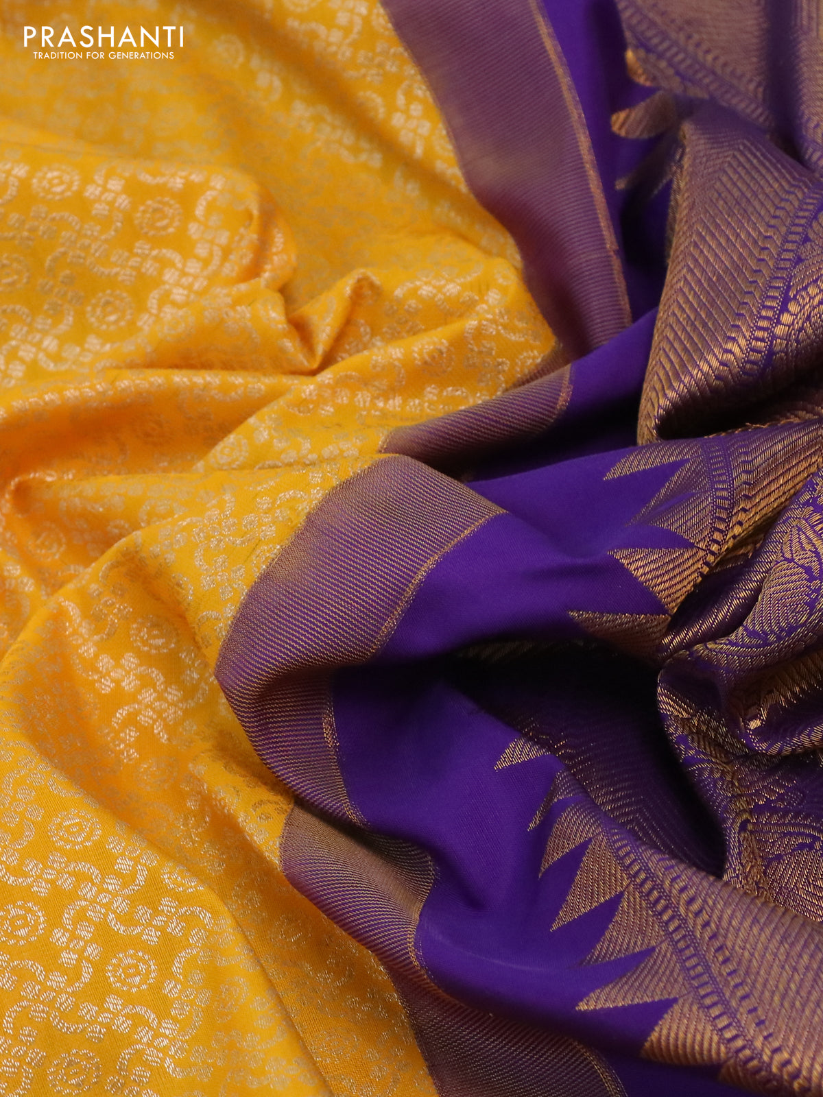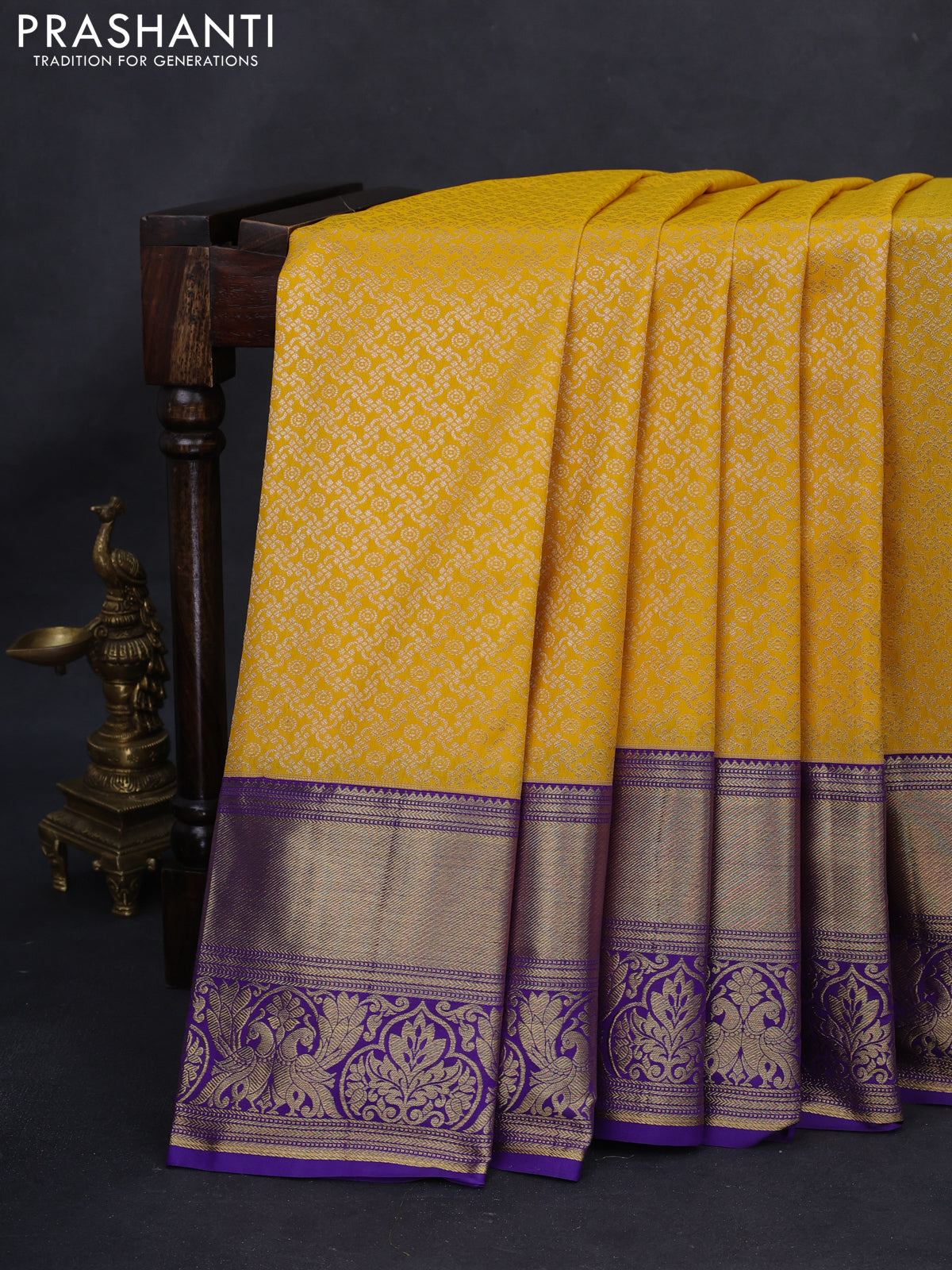 Kanchipuram silk saree yellow and violet with allover silver zari woven brocade weaves and long rich zari woven border
